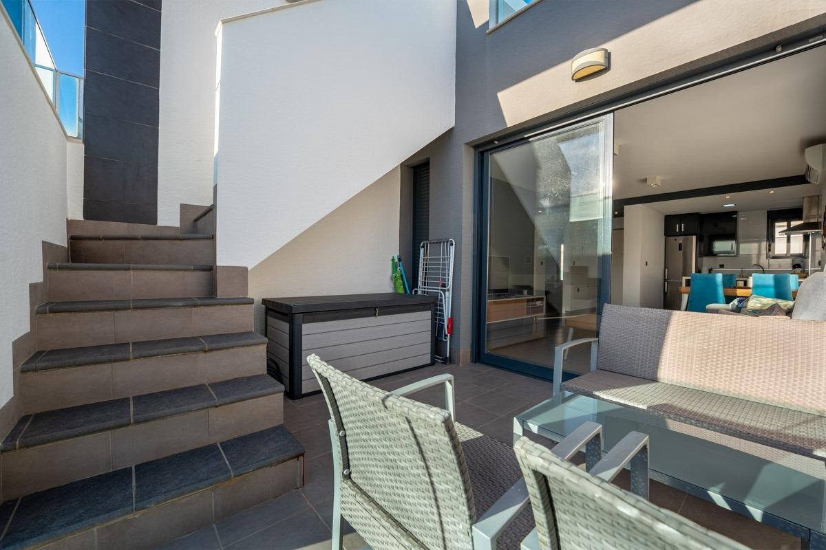 Este elegante ático, construido en 2016, se encuentra en la popular urbanización Oasis Beach en Punta Prima, ofreciendo la combinación perfecta de confort, diseño moderno y una ubicación fantástica en la Costa Blanca.~Disfrutará de una comunidad familiar y muy bien cuidada, con amplias zonas verdes, piscina comunitaria y un ambiente tranquilo, ideal como vivienda vacacional, residencia permanente o una inversión rentable con un excelente potencial de alquiler.~~El apartamento cuenta con dos dormitorios amplios y luminosos con armarios empotrados, así como dos modernos cuartos de baño, uno de ellos en suite.~El salón y la cocina de planta abierta crean una sensación de luminosidad y amplitud, y desde el balcón orientado al este se puede disfrutar de las vistas de la piscina y la vegetación circundante.~Uno de los aspectos más destacados de la propiedad es la gran terraza privada en la azotea, que ofrece mucho espacio para tomar el sol, comer al aire libre y relajarse bajo el sol español, con vistas a la zona y a partes del mar Mediterráneo.~El apartamento también incluye aire acondicionado en todas las estancias y una plaza de aparcamiento subterráneo.~~Oasis Beach ofrece un entorno de vida seguro y agradable a poca distancia de playas, restaurantes, tiendas y todos los servicios necesarios.~A solo 40 minutos del aeropuerto de Alicante, esta ubicación combina la comodidad con la tranquilidad de una zona residencial exclusiva.~~Se trata de un apartamento moderno, listo para entrar a vivir, con una distribución bien pensada, hermosos espacios al aire libre y una ubicación que lo convierte en una vivienda muy codiciada en la Costa Blanca.~
