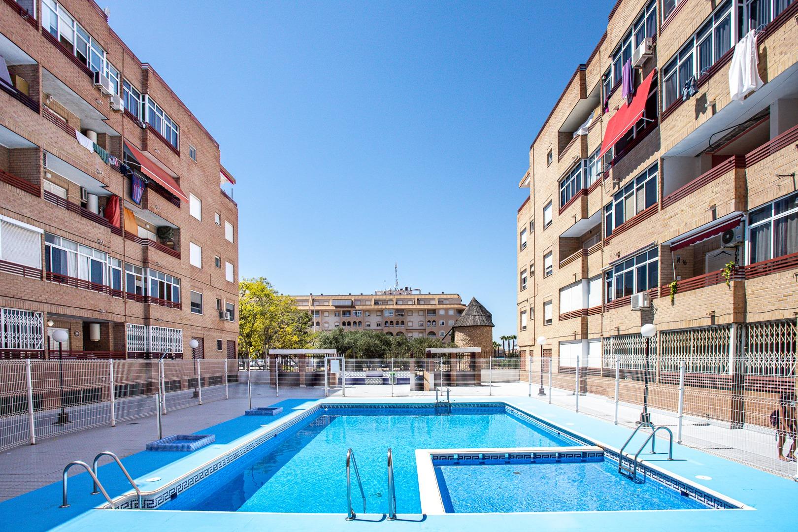 One-bedroom penthouse in a residential complex with a communal swimming pool.