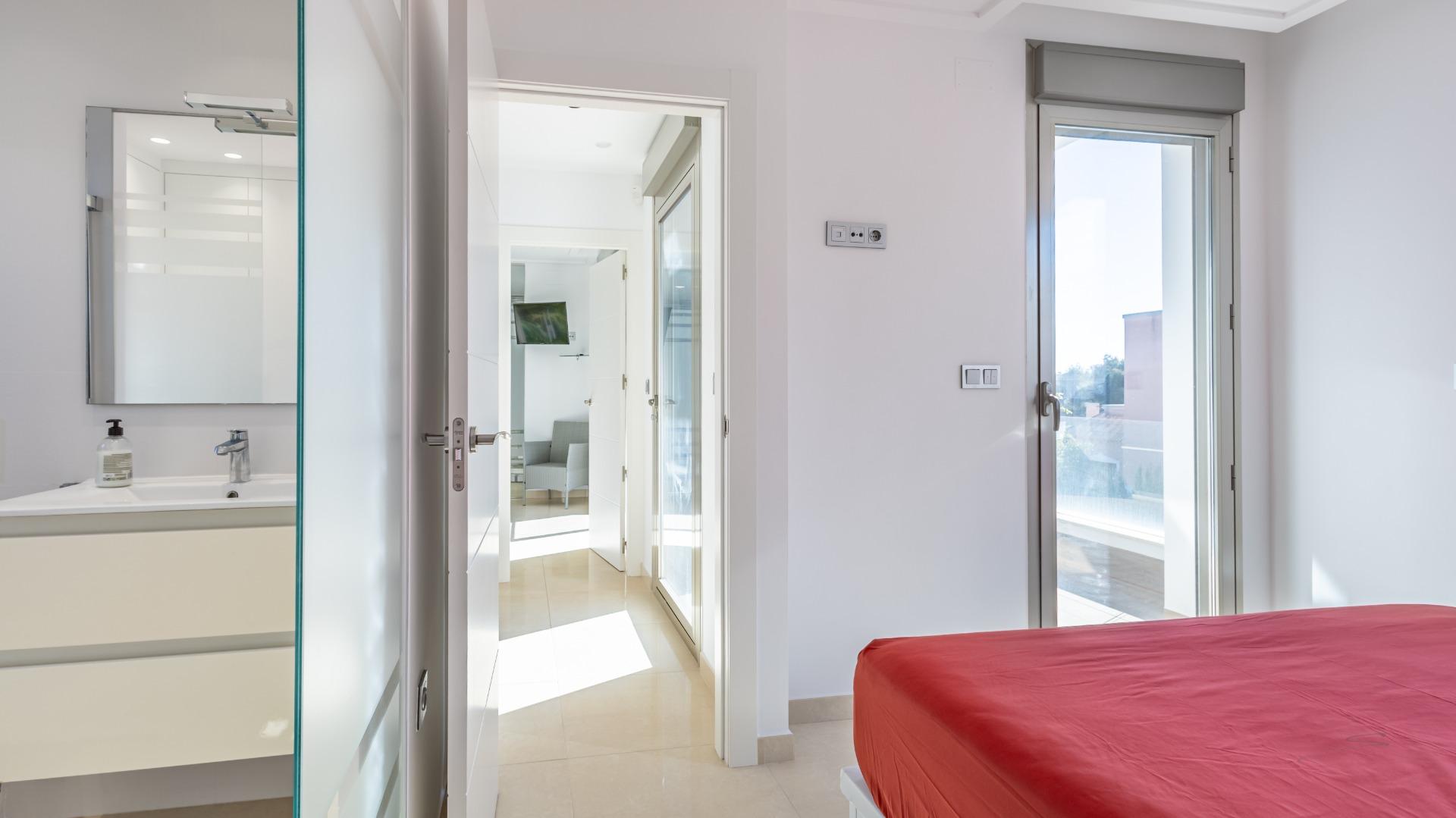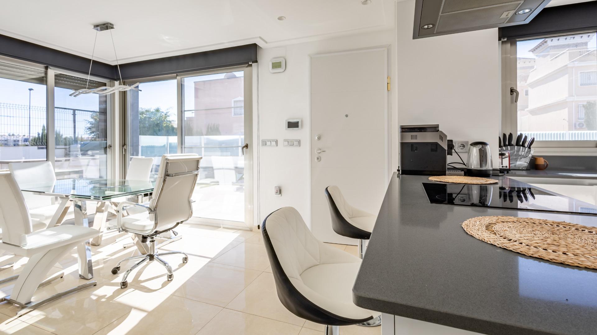 Welcome to this spectacular independent and fully energy-self-sufficient villa in Orihuela Costa, located just 4 km from the beaches and very close to the renowned La Zenia Boulevard shopping centre. Built in 2019 and practically unused, you will have the privilege of enjoying a home that is almost brand new and lacks absolutely nothing. Upon arrival, you are greeted by an electric entrance gate with video intercom, offering comfort and security from the moment you enter. You can park your car inside the plot and enjoy a fully paved garden that includes two cosy artificial grass areas perfect for sunbathing. The private pool, featuring an elegant waterfall, allows you to cool off during the hottest summer days, while the perimeter fencing combines iron and tempered glass for a modern and exclusive touch.~~The villa also features a fully equipped outdoor kitchen, ideal for enjoying the Mediterranean climate almost all year round. Stepping inside, you will notice the solid entrance door, which ensures maximum security for your home and family. The living room and kitchen stand out for their impressive natural light, creating spacious, comfortable and inviting areas. All windows have mosquito screens, and the living room includes a pellet stove that provides warmth during the winter months. The interior kitchen has a modern style with clean lines and ample storage capacity, equipped with an oven, microwave, dishwasher and a large American-style refrigerator. On this same floor there is a guest toilet that also houses the washer-dryer and water heater.~~Descending to the semi-basement, you will find a large space currently set up with a bar for preparing cocktails, though it can be adapted for any use according to your needs. This level includes two very spacious bedrooms, each with its own private bathroom, as well as a small storage room. The floor benefits from excellent insulation thanks to a one-metre-wide chamber surrounding the entire semi-basement, also ideal for additional storage. On the upper floor, there are two more bedrooms, each with an en-suite bathroom, along with an area used as a wardrobe or storage space. Both bedrooms provide access to a large terrace of approximately 30 m², perfect for enjoying the sun and tranquillity.~~Finally, the solarium is equipped with solar panels that make this wonderful house completely energy-independent, thanks to a high-capacity photovoltaic installation with batteries. In summary, this villa offers modernity, quality, design and efficiency in a privileged Mediterranean setting. If you are looking for a move-in-ready home, equipped down to the last detail and designed for maximum comfort, look no further: this is your home.~