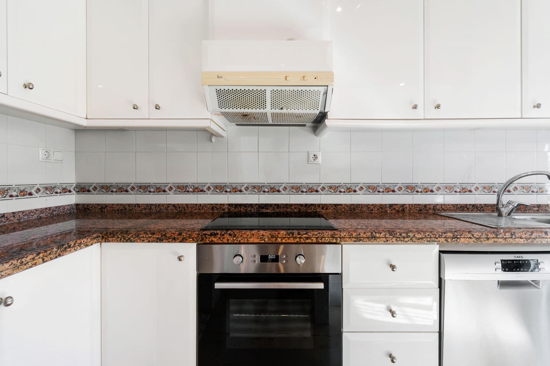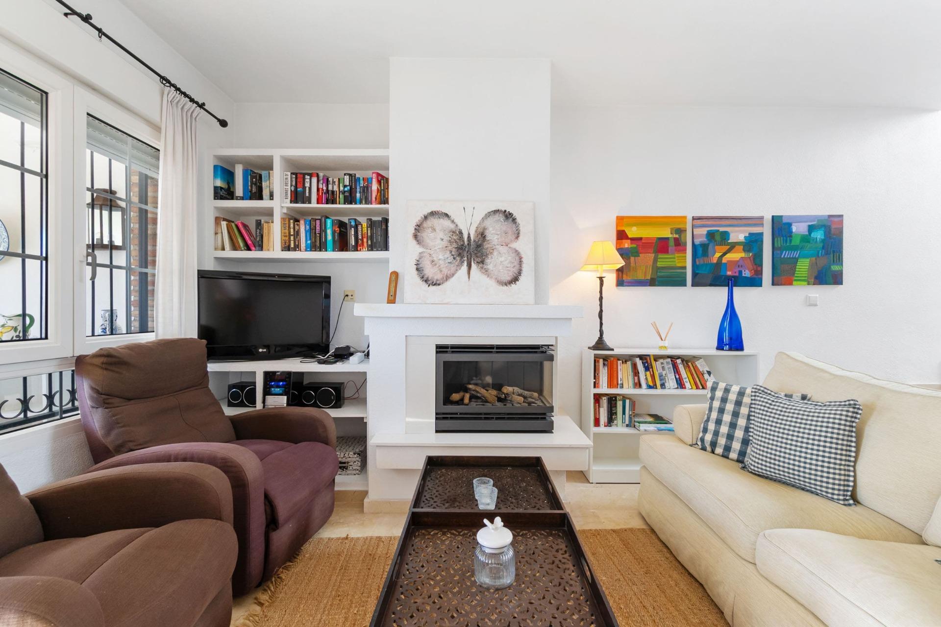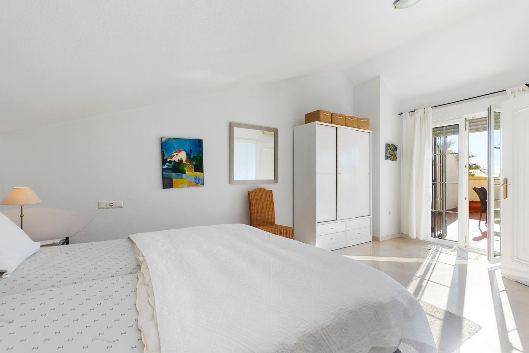 Adosado de dos plantas en Playa Flamenca, Orihuela Costa~~Ubicación privilegiada en la deseada zona de Playa Flamenca, Orihuela Costa, rodeada de todo tipo de servicios, restaurantes, supermercados, zonas verdes y transporte público. A poca distancia se encuentra el emblemático Centro Comercial La Zenia Boulevard, el mayor de la provincia de Alicante, con más de 150 tiendas de primeras marcas, una amplia oferta de restaurantes, bares, terrazas y una animada zona de ocio familiar y eventos durante todo el año.~~También está a escasos minutos de las mejores playas de Orihuela Costa, como Playa Flamenca, La Zenia y Cabo Roig, ideales para disfrutar del sol y del Mediterráneo.~~La vivienda se sitúa en un residencial privado y cerrado, que ofrece piscina comunitaria exclusiva para residentes, amplias zonas comunes y parking comunitario dentro del complejo, garantizando seguridad y comodidad.~~Al entrar en la propiedad, encontramos un soleado jardín embaldosado, perfecto para relajarse al aire libre y aprovechar nuestro clima privilegiado durante todo el año. Una terraza acristalada con vistas despejadas da paso al luminoso salón-comedor. La cocina de estilo americano, totalmente equipada, se integra de forma práctica y moderna con la zona de estar.~~En esta planta principal se ubican también dos dormitorios dobles y un baño completo. Desde uno de los dormitorios se accede a un patio trasero con trastero, ideal para almacenaje o como zona de lavandería.~~A través de una escalera interior accedemos al amplio dormitorio principal con baño en suite, que destaca por su espacio y luminosidad. Desde aquí se accede a una magnífica terraza de 27 m², un rincón ideal para comer al aire libre, tomar el sol o disfrutar de las vistas despejadas.~~La vivienda se entrega amueblada y lista para entrar a vivir, perfecta tanto como residencia habitual como para disfrutar de unas vacaciones junto al mar.~~Playa Flamenca es una de las zonas más demandadas de Orihuela Costa, conocida por su ambiente tranquilo y su cercanía a todos los servicios, campos de golf, colegios internacionales y las calas más bonitas de la costa alicantina.~~No pierda la oportunidad de visitar esta magnífica vivienda. Contáctenos hoy mismo para más información o para concertar una cita.~
