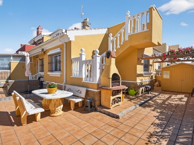 Ubicado en Residencial Sunlake I, en la zona de Torretas II de Torrevieja, este adosado en esquina ofrece una vivienda cómoda en una sola planta con amplios espacios exteriores para disfrutar del clima mediterráneo.~~La propiedad dispone de tres dormitorios, un baño completo y un aseo de cortesía, así como un salón-comedor luminoso con cocina abierta de estilo americano, totalmente equipada. Gracias a su orientación suroeste y posición en esquina, la vivienda recibe abundante luz natural durante gran parte del día.~~En el exterior, la vivienda cuenta con un jardín en esquina privado con entrada para coche y espacio para aparcar dentro de la parcela. El espacio exterior está pensado para disfrutar del estilo de vida mediterráneo, con zona chill-out para reuniones, barbacoa y caseta de madera para almacenamiento.~~Una escalera exterior conduce a un amplio solárium de 37 m², perfecto para relajarse o disfrutar del tiempo con familia y amigos.~~La vivienda se vende amueblada y en estado listo para entrar a vivir. Los residentes del residencial también disfrutan de acceso a la piscina comunitaria de uso exclusivo para propietarios.~~La ubicación es muy conveniente, cercana a centros comerciales como Habaneras y Carrefour, y una amplia gama de supermercados, así como colegios, Parque de La Siesta, carriles bici y zonas de paseo, y con fácil acceso al centro de Torrevieja.~~"No pierdas la oportunidad de conocer esta vivienda en persona; contáctanos hoy mismo y agenda tu visita."~~~