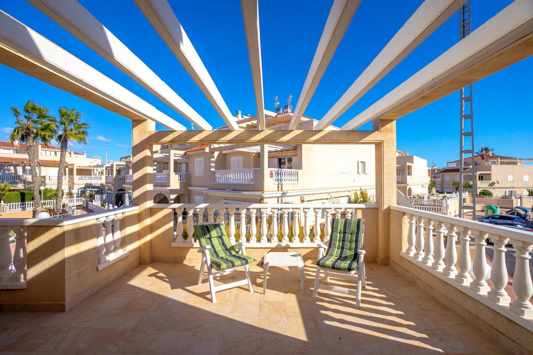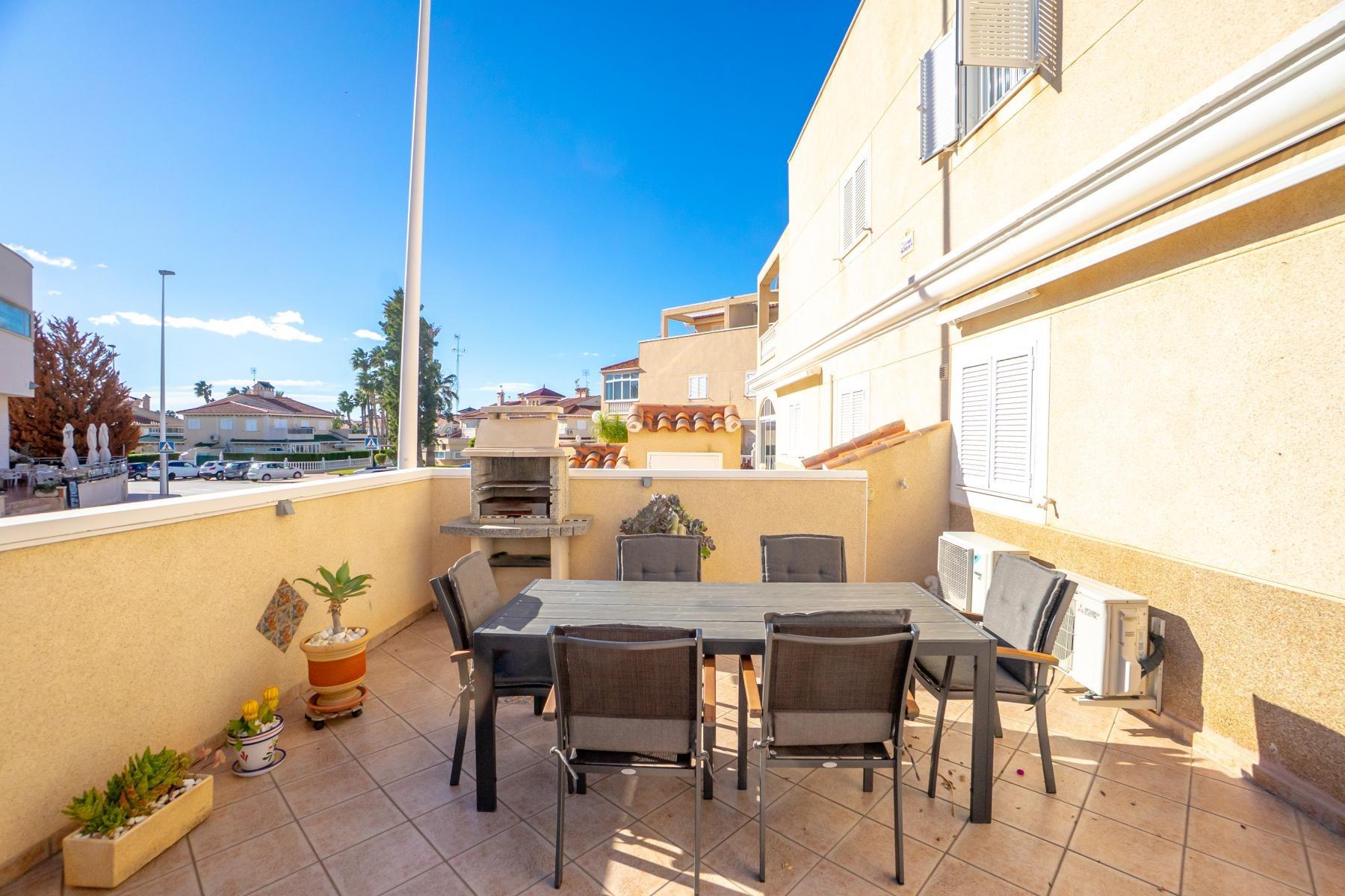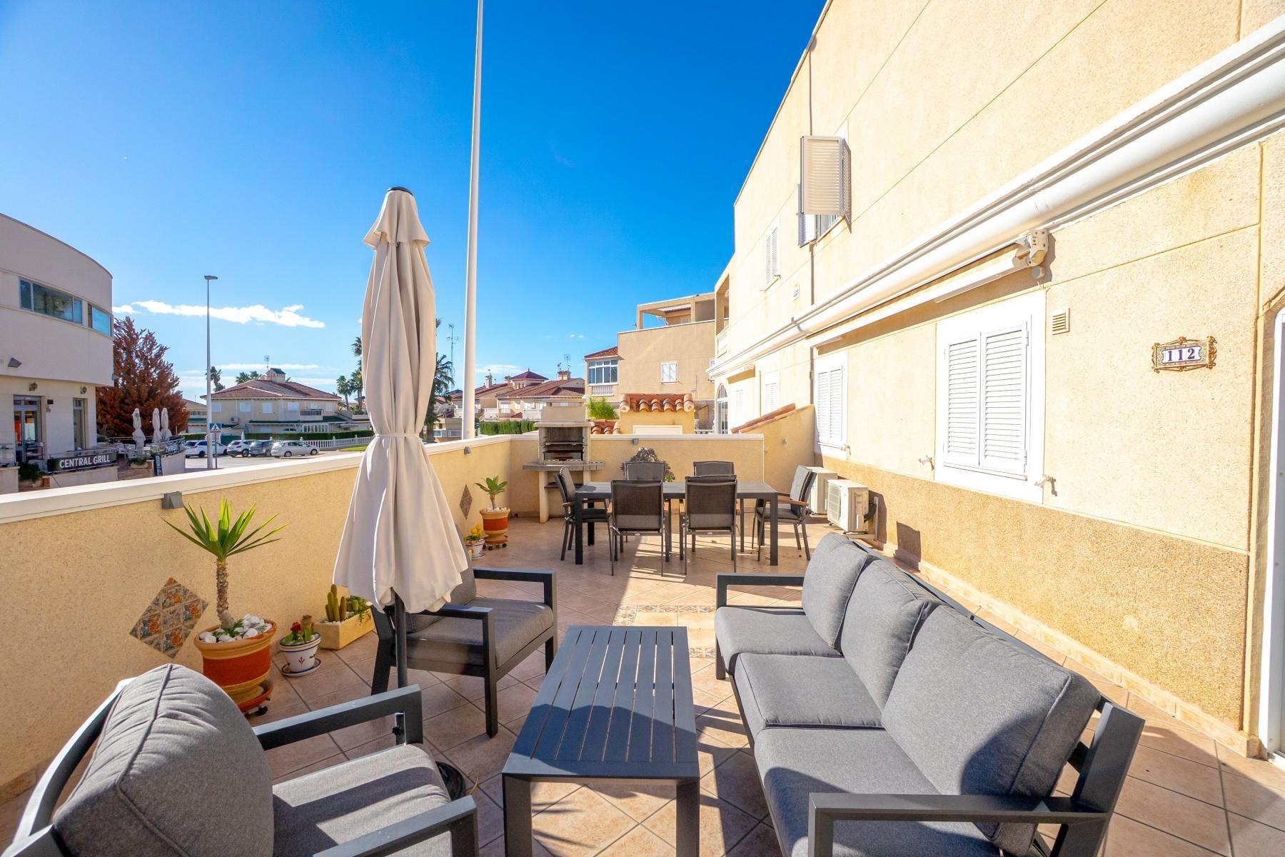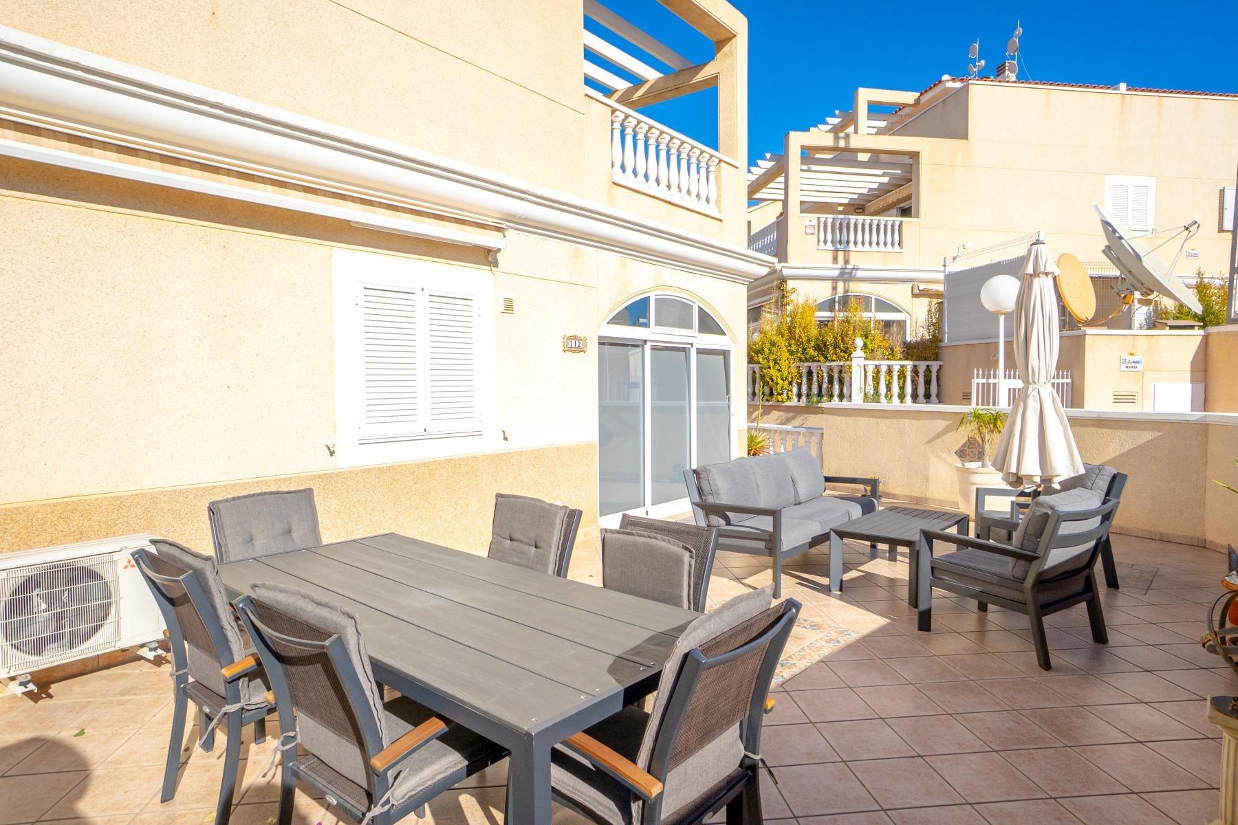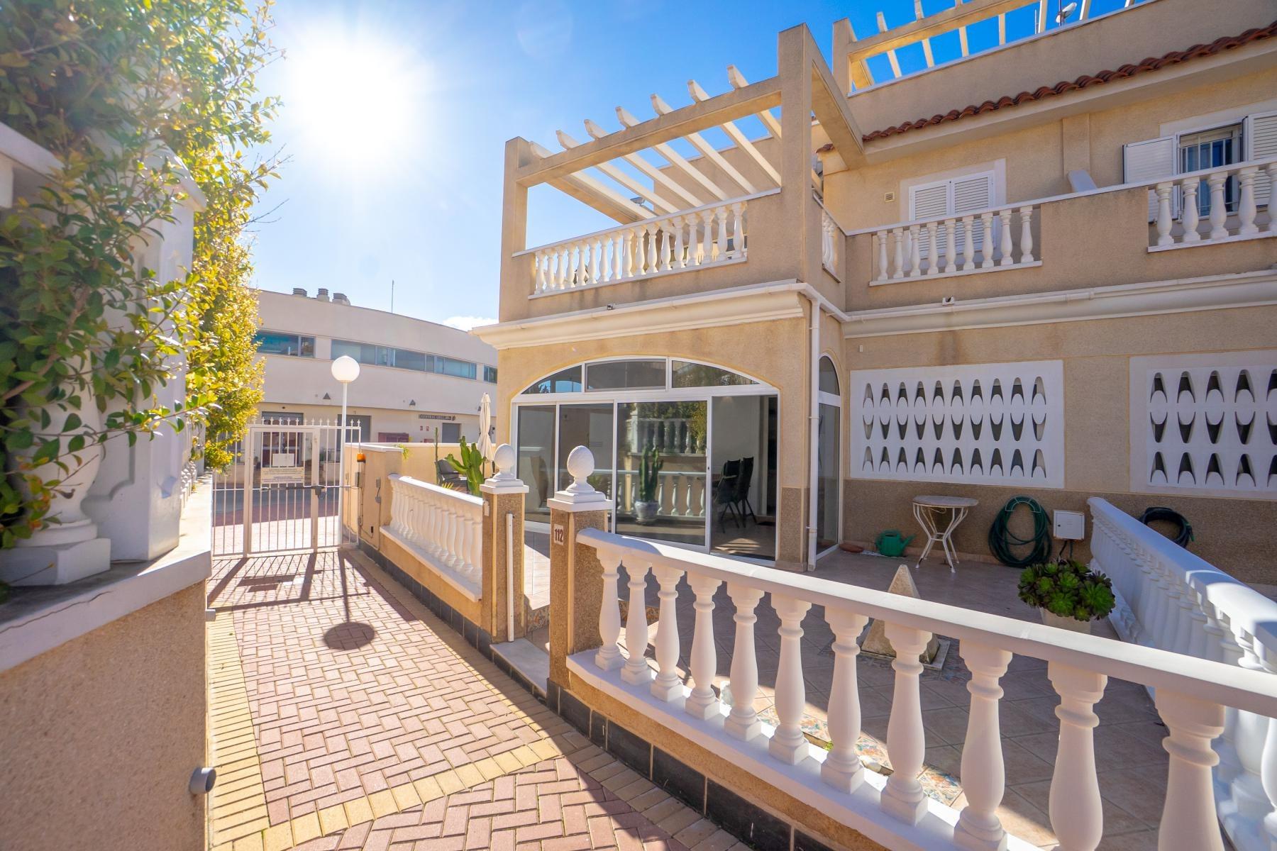 Adosado tipo Quad en esquina, de dos plantas más solárium, con escalera interior y ubicado a pocos pasos de la piscina comunitaria, en la consolidada y demandada urbanización Zeniamar V, Orihuela Costa. Una propiedad que destaca por su luminosidad, comodidad y entorno tranquilo, ideal tanto como residencia habitual como vivienda vacacional.~~La urbanización ofrece amplias zonas ajardinadas, gran piscina comunitaria y un ambiente cuidado, con una excelente ubicación próxima a supermercados, cafeterías, restaurantes, el reconocido Centro Comercial Zenia Boulevard, el mercadillo de Playa Flamenca y las playas de Orihuela Costa.~~En la planta baja, la vivienda dispone de una amplia terraza acristalada que conecta directamente con el salón, cocina americana totalmente equipada con electrodomésticos y galería, un dormitorio, un baño completo reformado con suelo radiante, y un práctico trastero.~~La primera planta cuenta con dos dormitorios adicionales, un segundo baño y una terraza con zona acristalada y zona descubierta, con vistas despejadas, ideal para el descanso o el ocio.~~En la planta solárium encontramos una salita polivalente, adaptable a distintos usos (almacenamiento, despacho, zona relax) y una amplia terraza descubierta, perfecta para disfrutar del excelente clima de la zona durante todo el año.~~La propiedad se completa con un jardín embaldosado en esquina de aproximadamente 69 m², con espacio suficiente para comedor exterior, barbacoa o zona chill-out, ideal para reuniones familiares o con amigos.~~La vivienda se encuentra en perfecto estado de conservación, dispone de aire acondicionado por splits inverter en todas las estancias, se vende totalmente amueblada y equipada, e incluye plaza de garaje y trastero en el garaje subterráneo del residencial.~