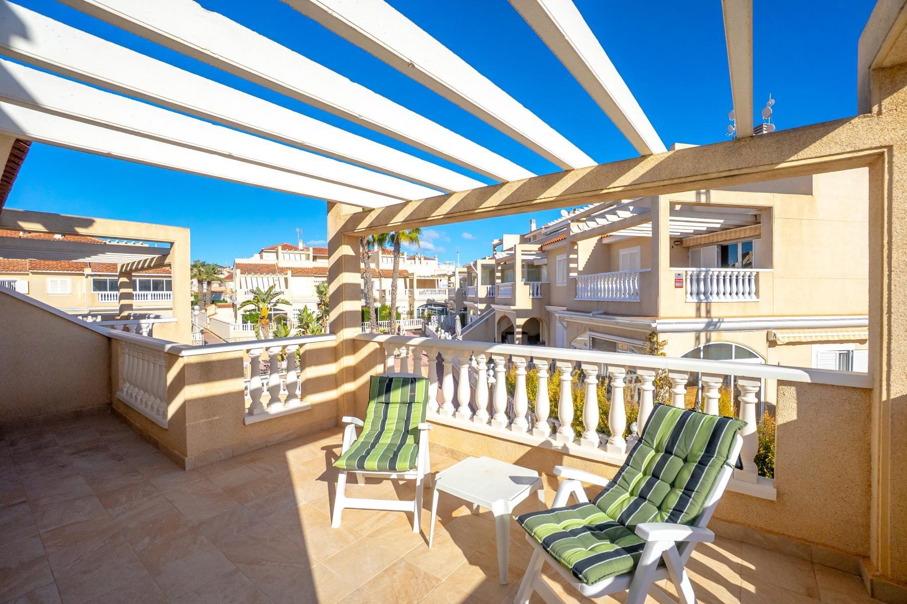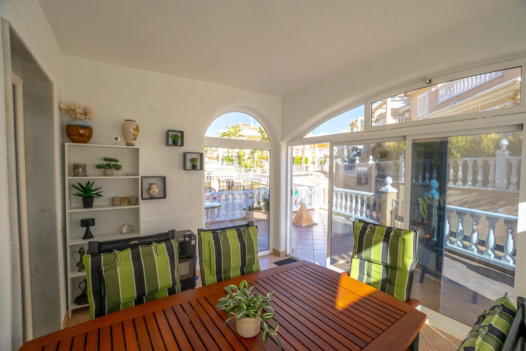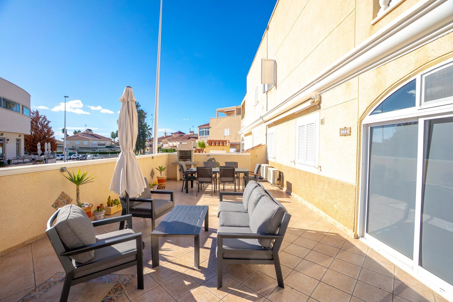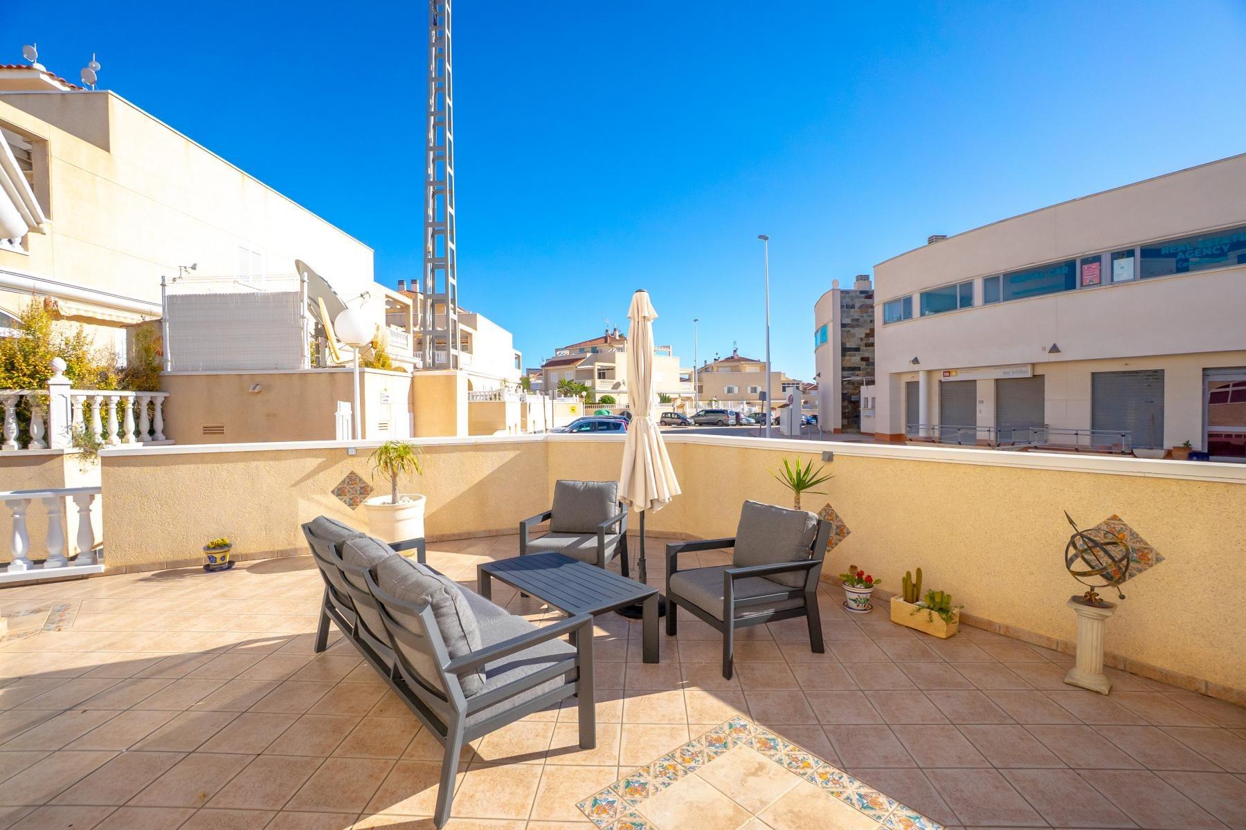 Adosado tipo Quad en esquina, de dos plantas más solárium, con escalera interior y ubicado a pocos pasos de la piscina comunitaria, en la consolidada y demandada urbanización Zeniamar V, Orihuela Costa. Una propiedad que destaca por su luminosidad, comodidad y entorno tranquilo, ideal tanto como residencia habitual como vivienda vacacional.~~La urbanización ofrece amplias zonas ajardinadas, gran piscina comunitaria y un ambiente cuidado, con una excelente ubicación próxima a supermercados, cafeterías, restaurantes, el reconocido Centro Comercial Zenia Boulevard, el mercadillo de Playa Flamenca y las playas de Orihuela Costa.~~En la planta baja, la vivienda dispone de una amplia terraza acristalada que conecta directamente con el salón, cocina americana totalmente equipada con electrodomésticos y galería, un dormitorio, un baño completo reformado con suelo radiante, y un práctico trastero.~~La primera planta cuenta con dos dormitorios adicionales, un segundo baño y una terraza con zona acristalada y zona descubierta, con vistas despejadas, ideal para el descanso o el ocio.~~En la planta solárium encontramos una salita polivalente, adaptable a distintos usos (almacenamiento, despacho, zona relax) y una amplia terraza descubierta, perfecta para disfrutar del excelente clima de la zona durante todo el año.~~La propiedad se completa con un jardín embaldosado en esquina de aproximadamente 69 m², con espacio suficiente para comedor exterior, barbacoa o zona chill-out, ideal para reuniones familiares o con amigos.~~La vivienda se encuentra en perfecto estado de conservación, dispone de aire acondicionado por splits inverter en todas las estancias, se vende totalmente amueblada y equipada, e incluye plaza de garaje y trastero en el garaje subterráneo del residencial.~