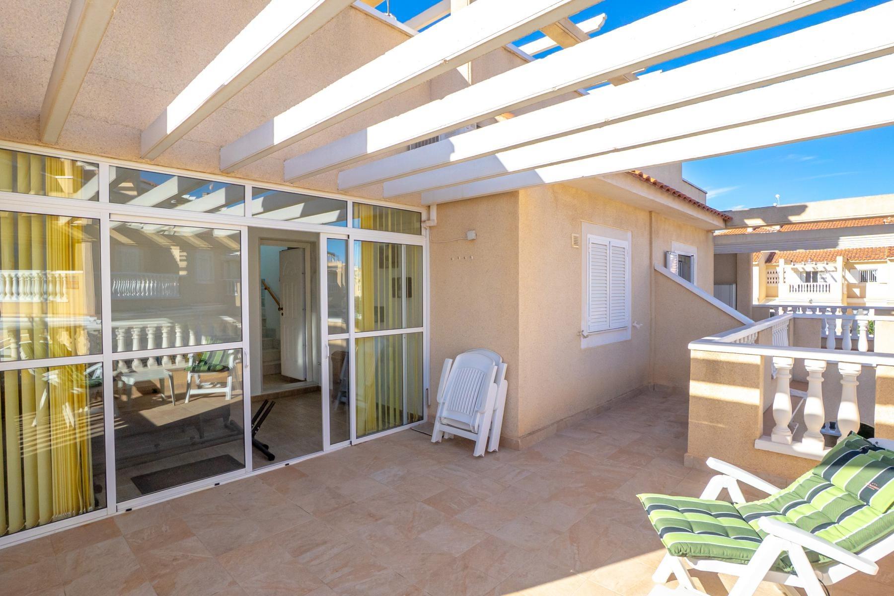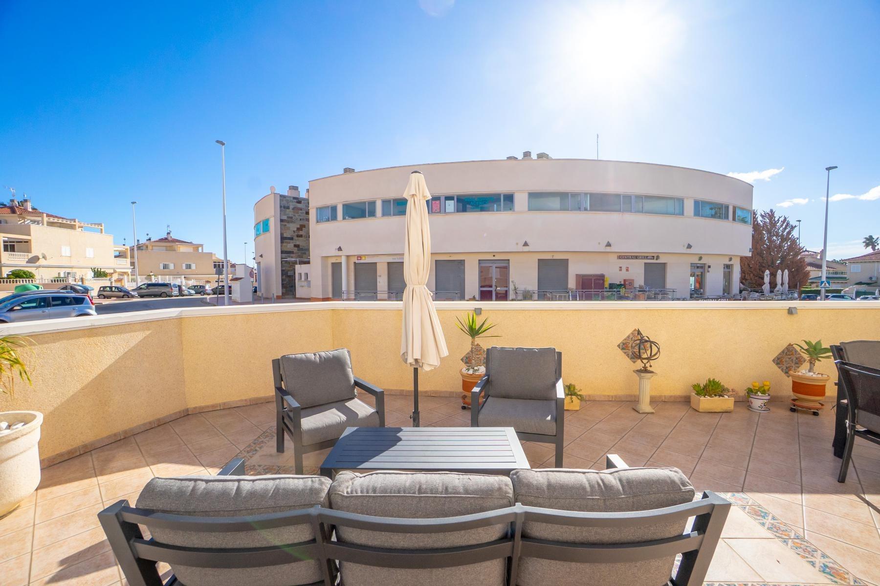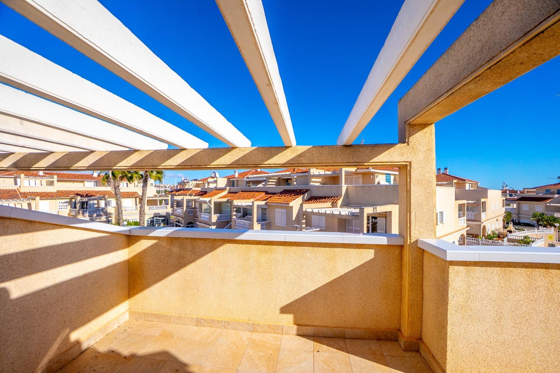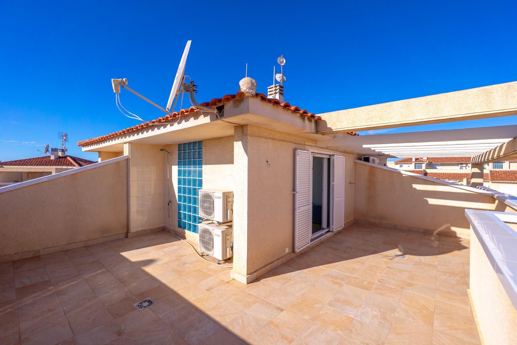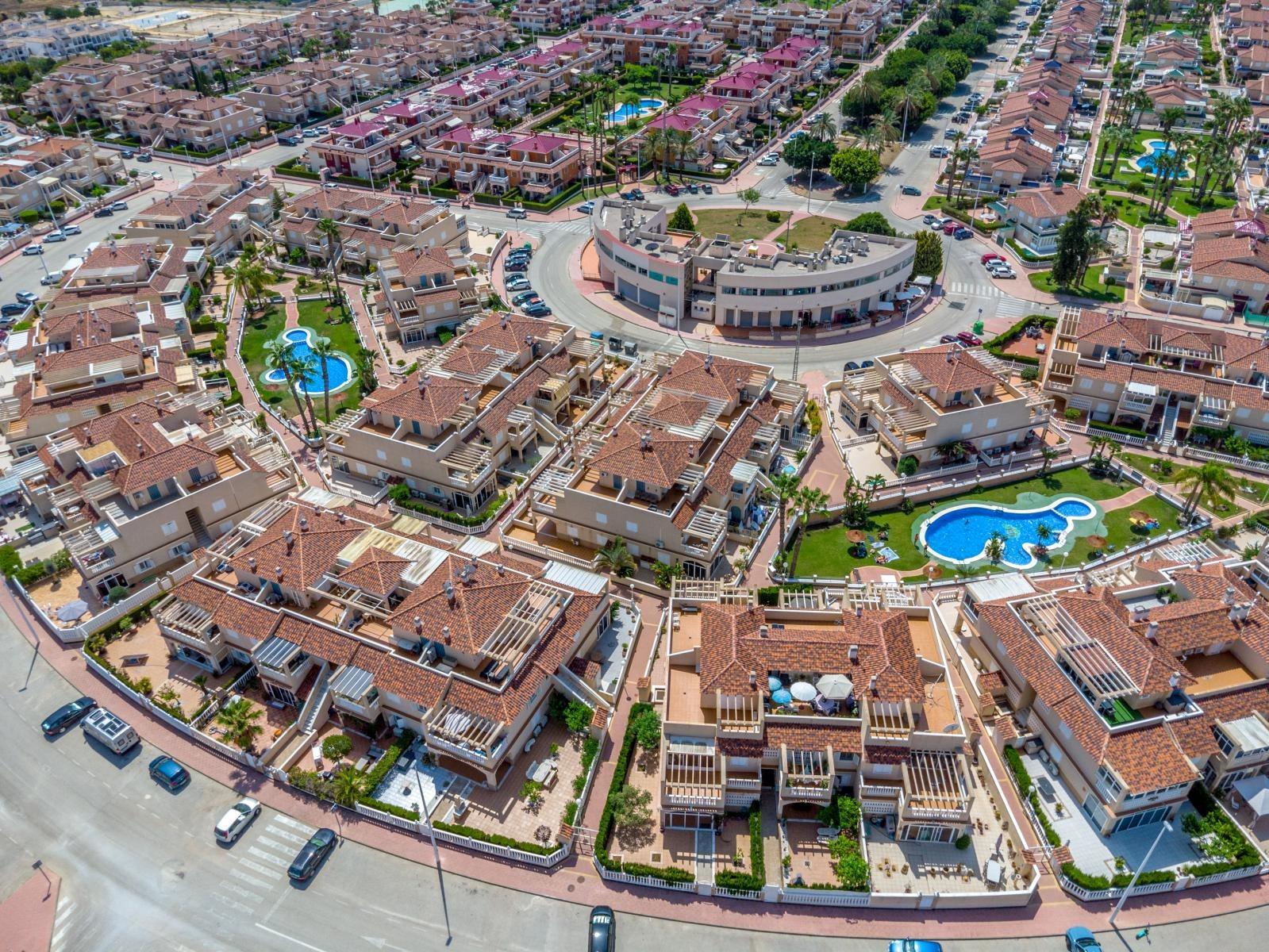 Adosado tipo Quad en esquina, de dos plantas más solárium, con escalera interior y ubicado a pocos pasos de la piscina comunitaria, en la consolidada y demandada urbanización Zeniamar V, Orihuela Costa. Una propiedad que destaca por su luminosidad, comodidad y entorno tranquilo, ideal tanto como residencia habitual como vivienda vacacional.~~La urbanización ofrece amplias zonas ajardinadas, gran piscina comunitaria y un ambiente cuidado, con una excelente ubicación próxima a supermercados, cafeterías, restaurantes, el reconocido Centro Comercial Zenia Boulevard, el mercadillo de Playa Flamenca y las playas de Orihuela Costa.~~En la planta baja, la vivienda dispone de una amplia terraza acristalada que conecta directamente con el salón, cocina americana totalmente equipada con electrodomésticos y galería, un dormitorio, un baño completo reformado con suelo radiante, y un práctico trastero.~~La primera planta cuenta con dos dormitorios adicionales, un segundo baño y una terraza con zona acristalada y zona descubierta, con vistas despejadas, ideal para el descanso o el ocio.~~En la planta solárium encontramos una salita polivalente, adaptable a distintos usos (almacenamiento, despacho, zona relax) y una amplia terraza descubierta, perfecta para disfrutar del excelente clima de la zona durante todo el año.~~La propiedad se completa con un jardín embaldosado en esquina de aproximadamente 69 m², con espacio suficiente para comedor exterior, barbacoa o zona chill-out, ideal para reuniones familiares o con amigos.~~La vivienda se encuentra en perfecto estado de conservación, dispone de aire acondicionado por splits inverter en todas las estancias, se vende totalmente amueblada y equipada, e incluye plaza de garaje y trastero en el garaje subterráneo del residencial.~