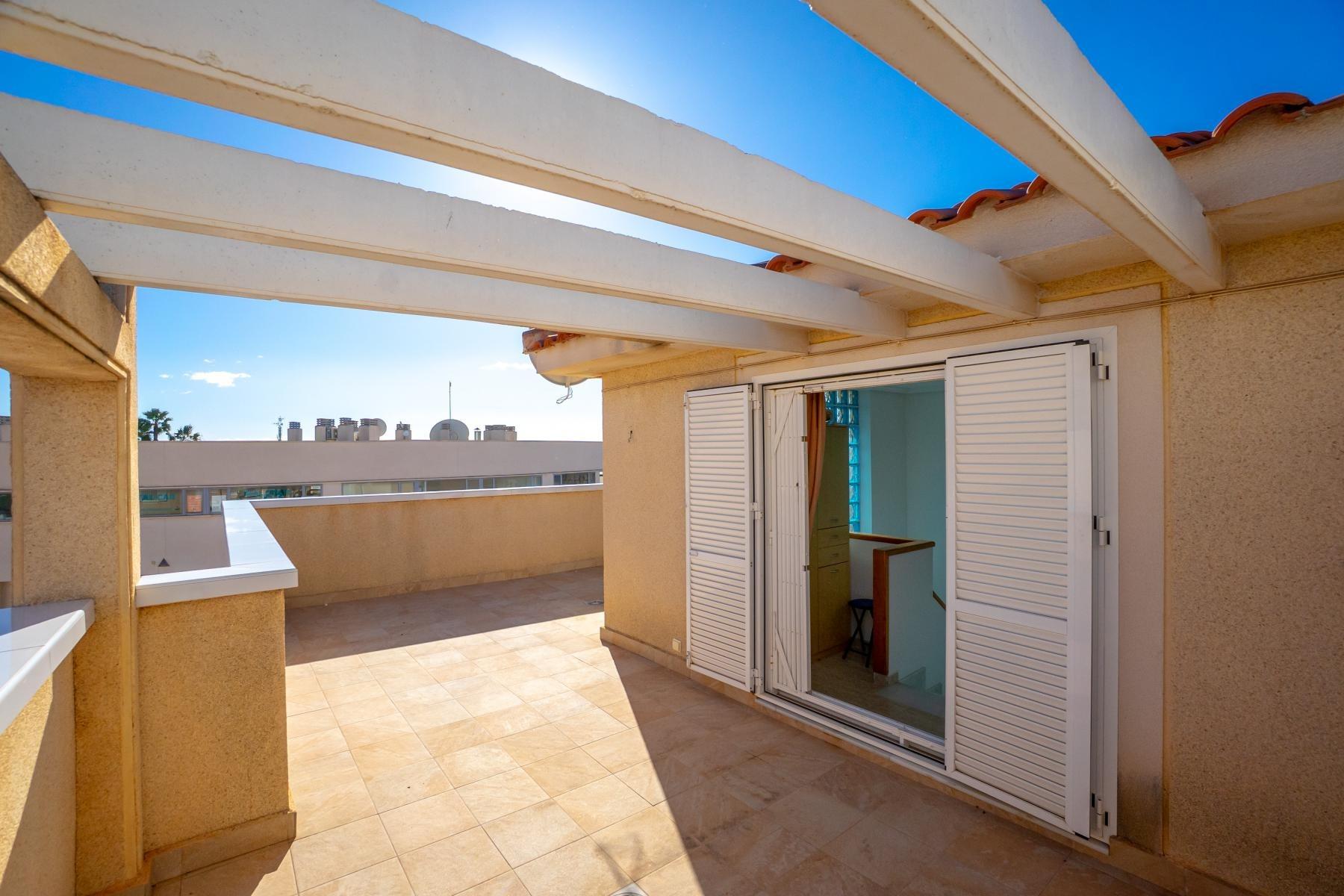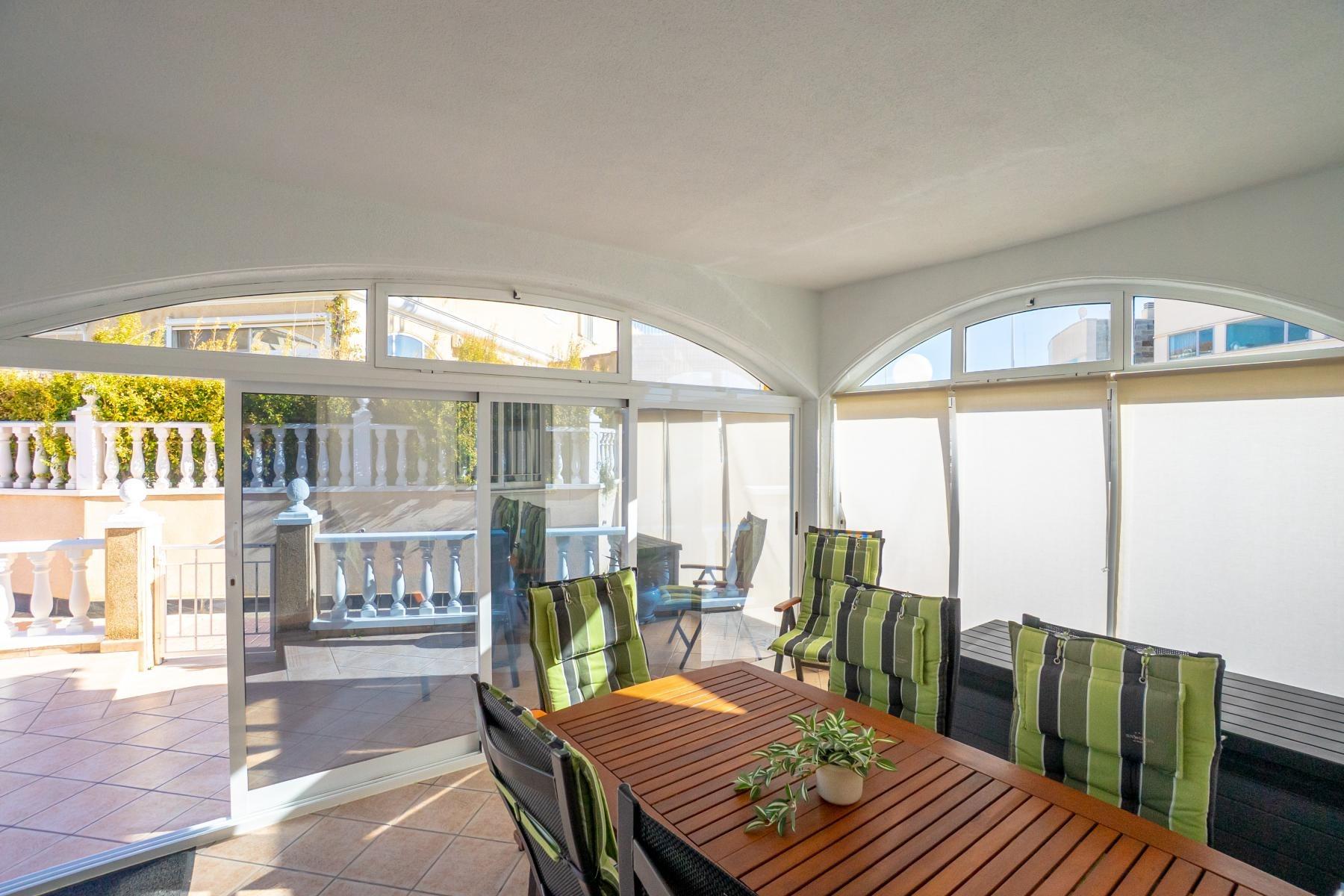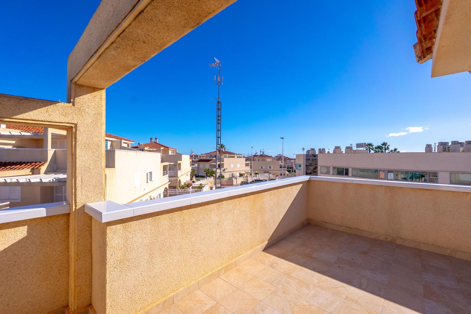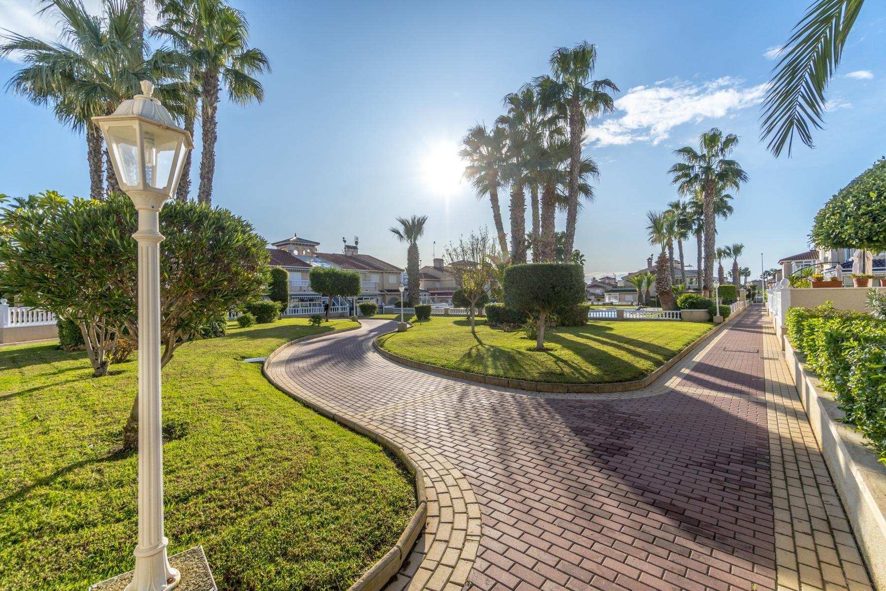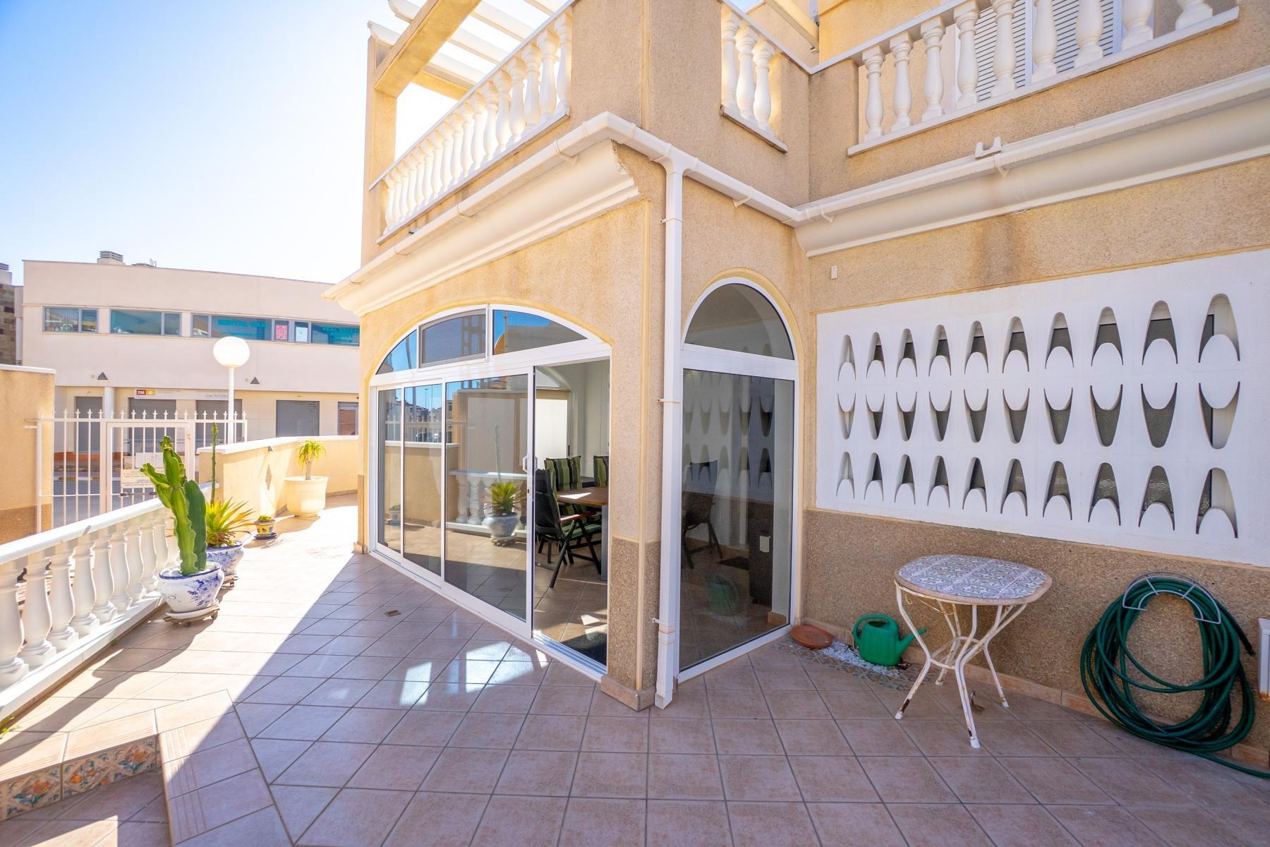 Adosado tipo Quad en esquina, de dos plantas más solárium, con escalera interior y ubicado a pocos pasos de la piscina comunitaria, en la consolidada y demandada urbanización Zeniamar V, Orihuela Costa. Una propiedad que destaca por su luminosidad, comodidad y entorno tranquilo, ideal tanto como residencia habitual como vivienda vacacional.~~La urbanización ofrece amplias zonas ajardinadas, gran piscina comunitaria y un ambiente cuidado, con una excelente ubicación próxima a supermercados, cafeterías, restaurantes, el reconocido Centro Comercial Zenia Boulevard, el mercadillo de Playa Flamenca y las playas de Orihuela Costa.~~En la planta baja, la vivienda dispone de una amplia terraza acristalada que conecta directamente con el salón, cocina americana totalmente equipada con electrodomésticos y galería, un dormitorio, un baño completo reformado con suelo radiante, y un práctico trastero.~~La primera planta cuenta con dos dormitorios adicionales, un segundo baño y una terraza con zona acristalada y zona descubierta, con vistas despejadas, ideal para el descanso o el ocio.~~En la planta solárium encontramos una salita polivalente, adaptable a distintos usos (almacenamiento, despacho, zona relax) y una amplia terraza descubierta, perfecta para disfrutar del excelente clima de la zona durante todo el año.~~La propiedad se completa con un jardín embaldosado en esquina de aproximadamente 69 m², con espacio suficiente para comedor exterior, barbacoa o zona chill-out, ideal para reuniones familiares o con amigos.~~La vivienda se encuentra en perfecto estado de conservación, dispone de aire acondicionado por splits inverter en todas las estancias, se vende totalmente amueblada y equipada, e incluye plaza de garaje y trastero en el garaje subterráneo del residencial.~
