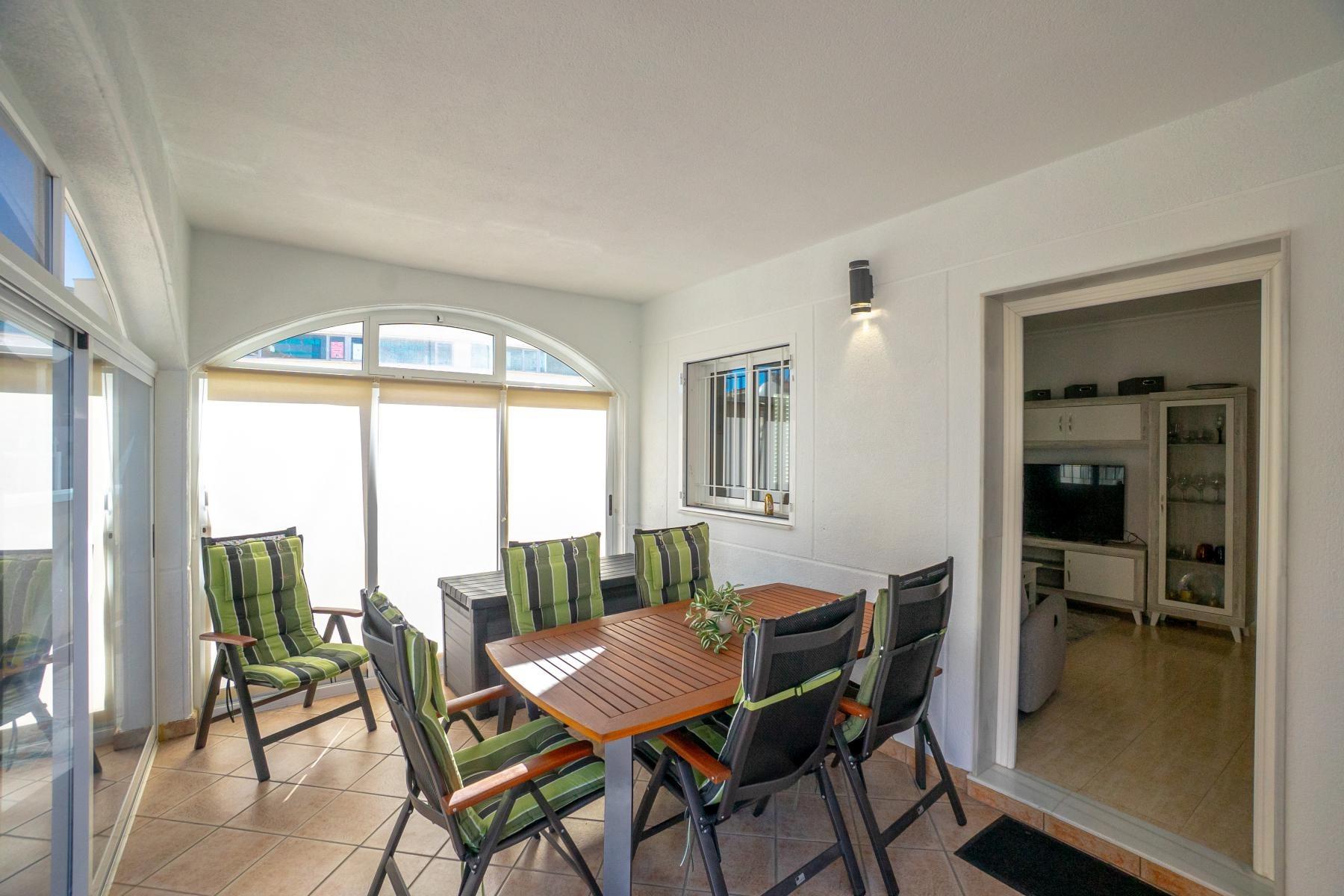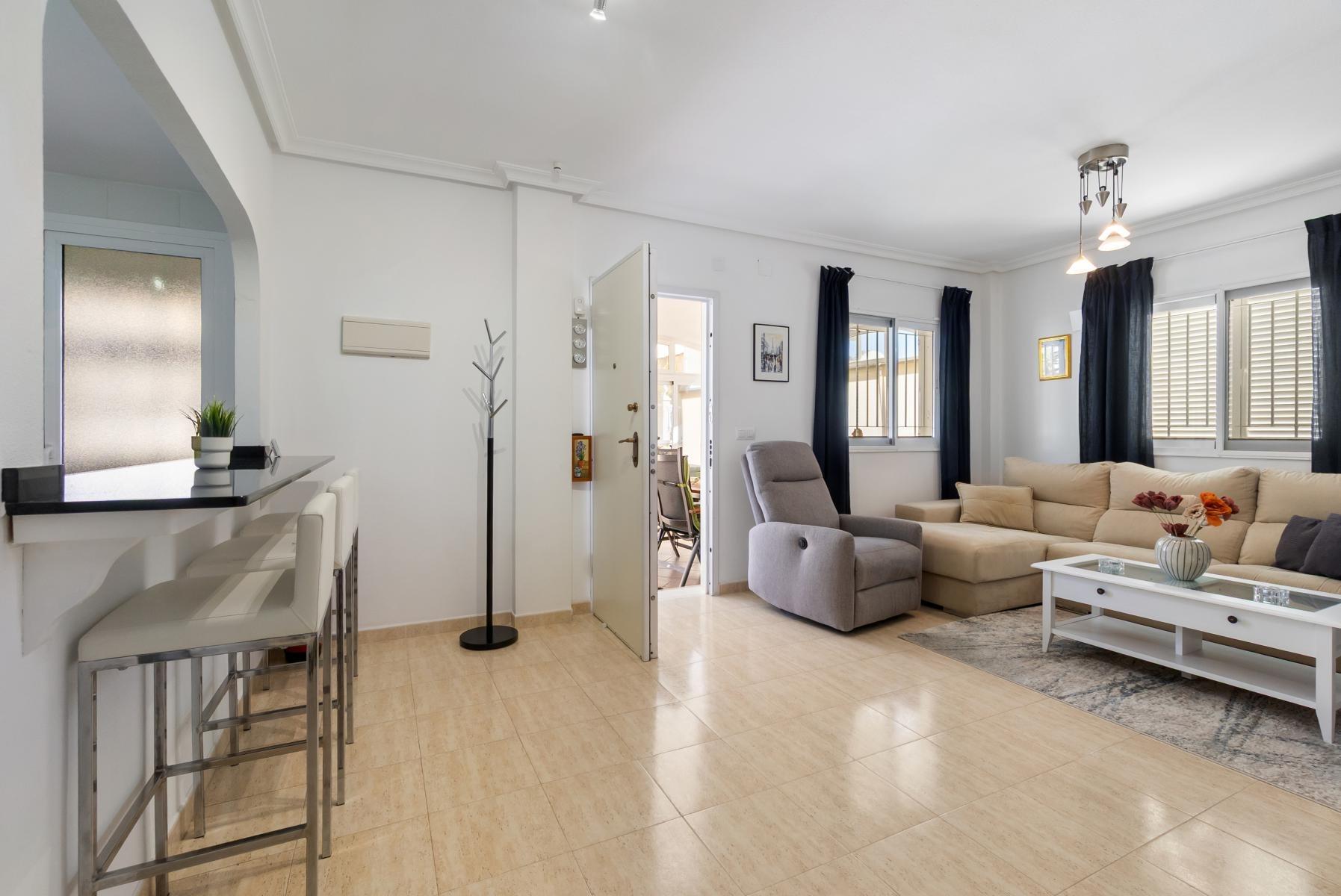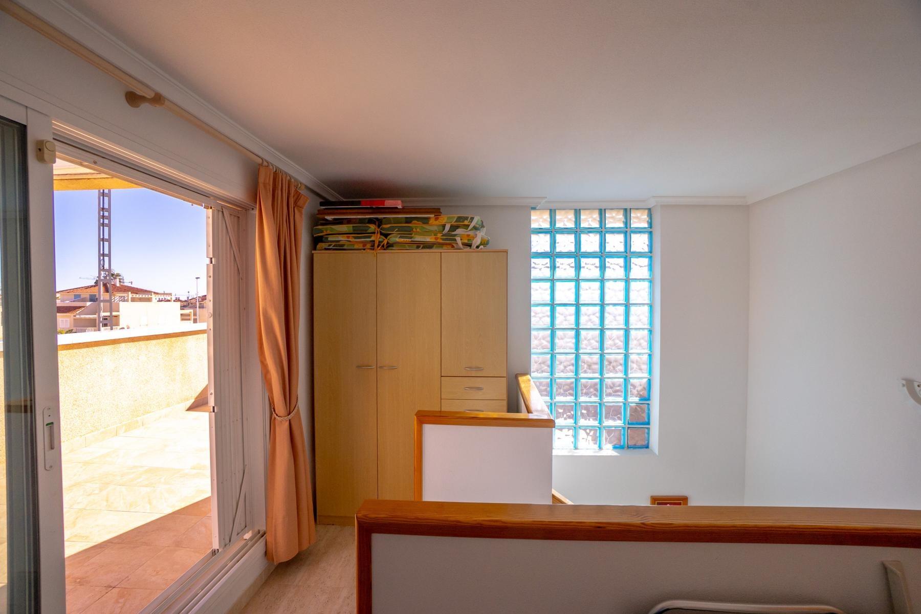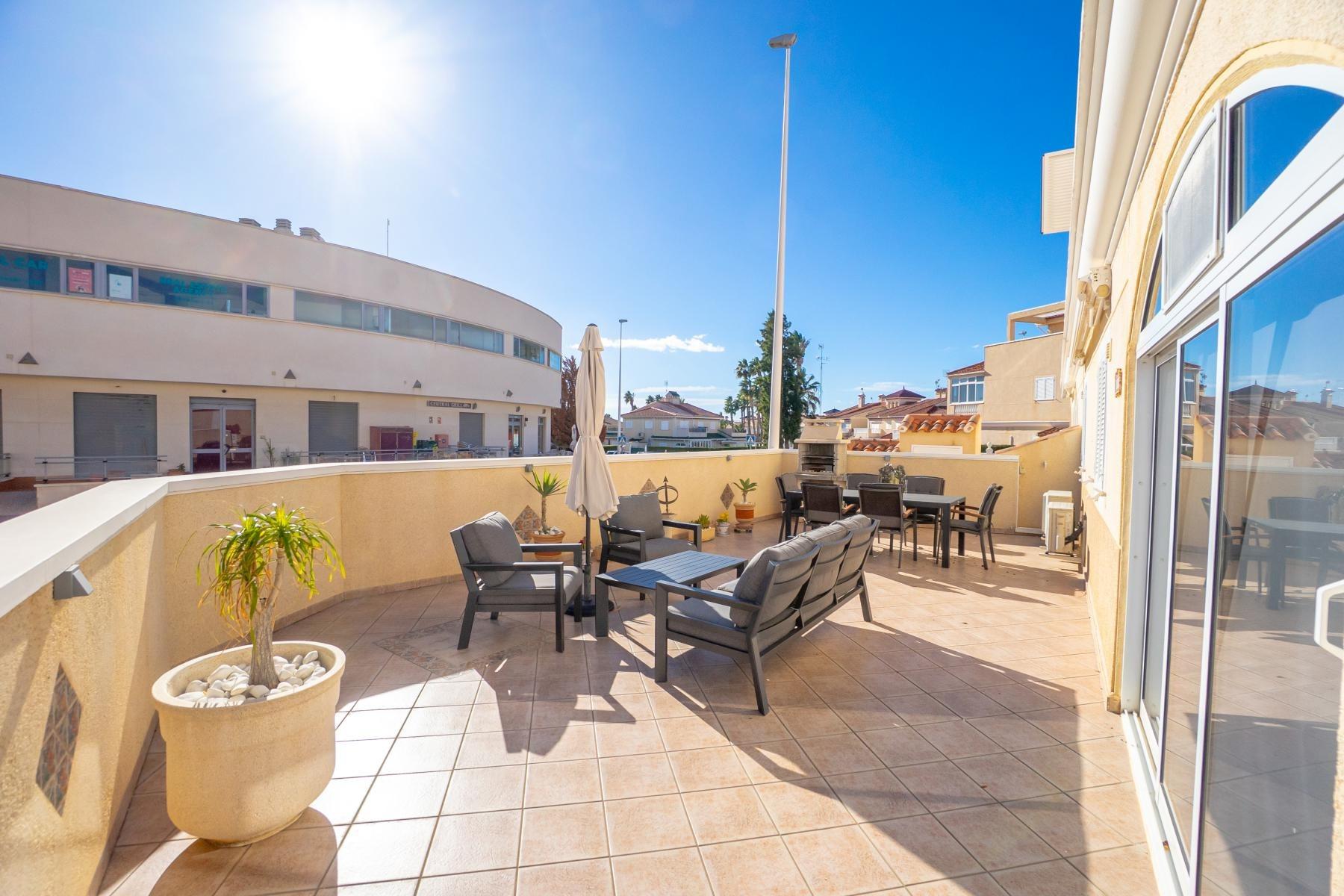 Adosado tipo Quad en esquina, de dos plantas más solárium, con escalera interior y ubicado a pocos pasos de la piscina comunitaria, en la consolidada y demandada urbanización Zeniamar V, Orihuela Costa. Una propiedad que destaca por su luminosidad, comodidad y entorno tranquilo, ideal tanto como residencia habitual como vivienda vacacional.~~La urbanización ofrece amplias zonas ajardinadas, gran piscina comunitaria y un ambiente cuidado, con una excelente ubicación próxima a supermercados, cafeterías, restaurantes, el reconocido Centro Comercial Zenia Boulevard, el mercadillo de Playa Flamenca y las playas de Orihuela Costa.~~En la planta baja, la vivienda dispone de una amplia terraza acristalada que conecta directamente con el salón, cocina americana totalmente equipada con electrodomésticos y galería, un dormitorio, un baño completo reformado con suelo radiante, y un práctico trastero.~~La primera planta cuenta con dos dormitorios adicionales, un segundo baño y una terraza con zona acristalada y zona descubierta, con vistas despejadas, ideal para el descanso o el ocio.~~En la planta solárium encontramos una salita polivalente, adaptable a distintos usos (almacenamiento, despacho, zona relax) y una amplia terraza descubierta, perfecta para disfrutar del excelente clima de la zona durante todo el año.~~La propiedad se completa con un jardín embaldosado en esquina de aproximadamente 69 m², con espacio suficiente para comedor exterior, barbacoa o zona chill-out, ideal para reuniones familiares o con amigos.~~La vivienda se encuentra en perfecto estado de conservación, dispone de aire acondicionado por splits inverter en todas las estancias, se vende totalmente amueblada y equipada, e incluye plaza de garaje y trastero en el garaje subterráneo del residencial.~
