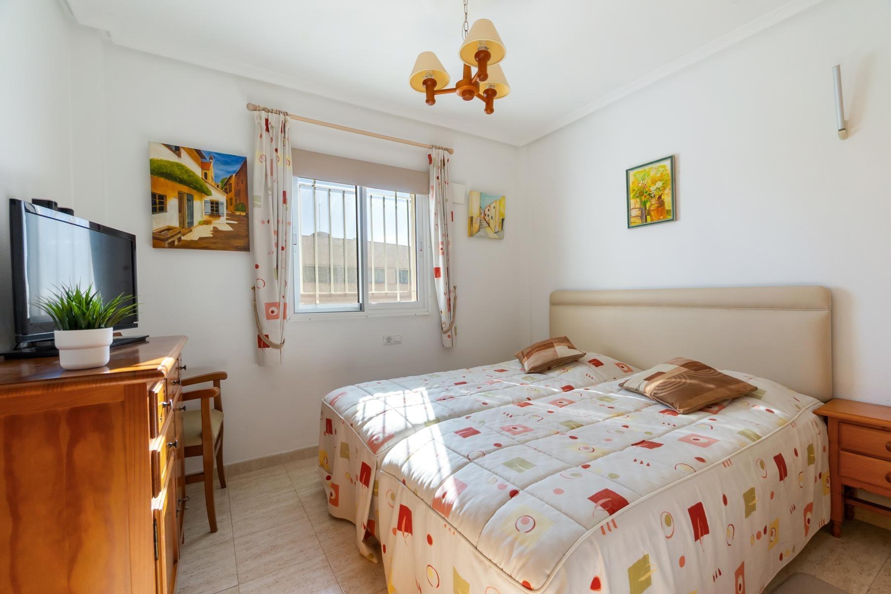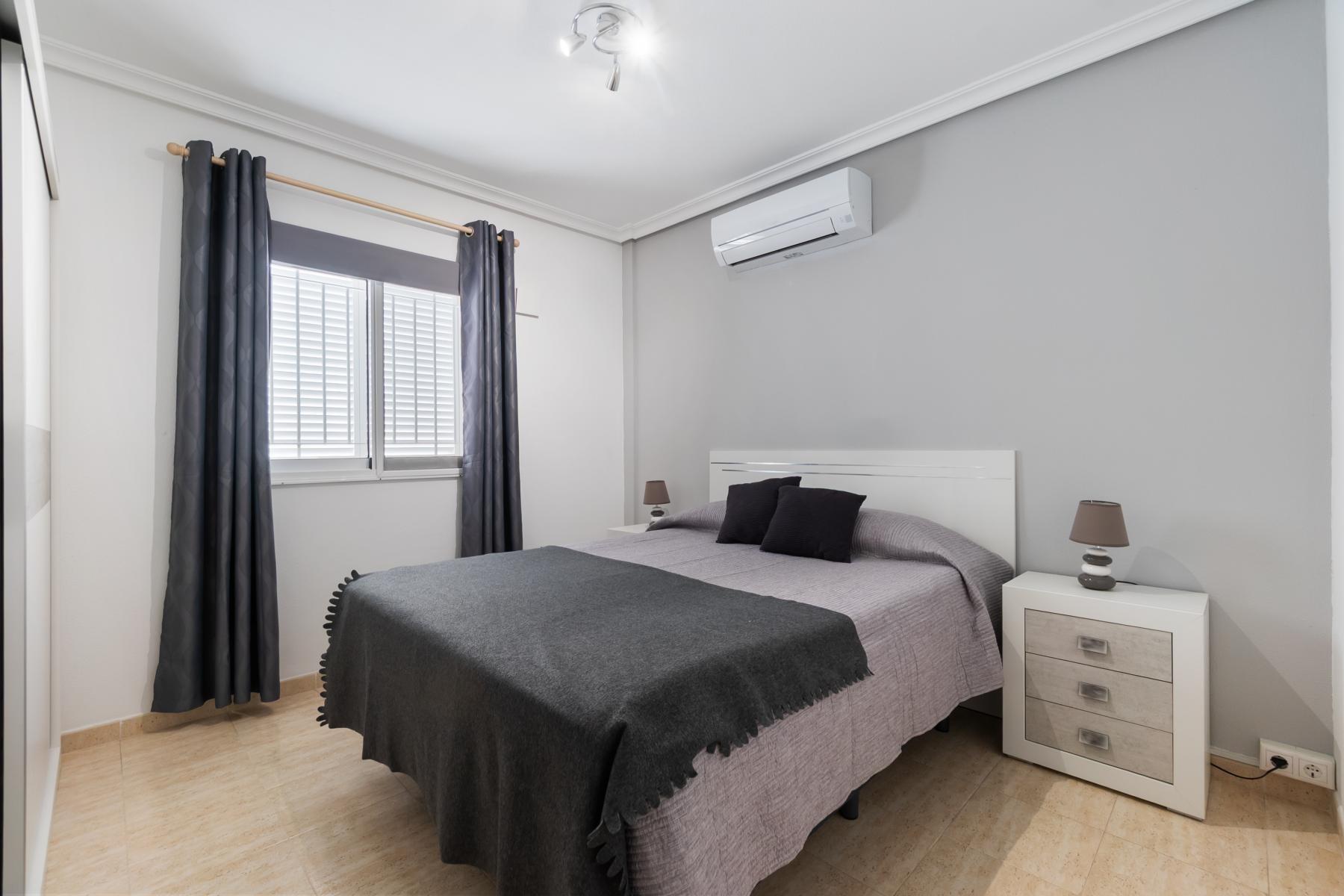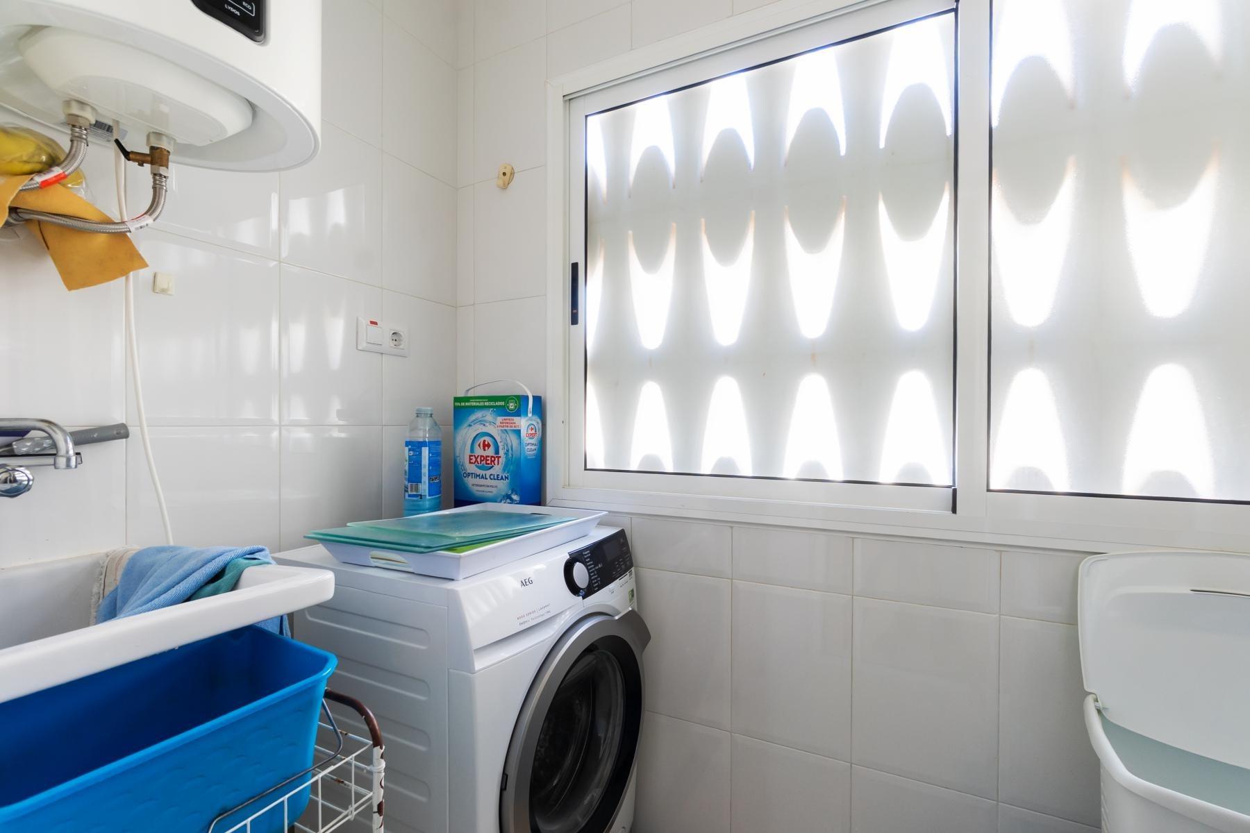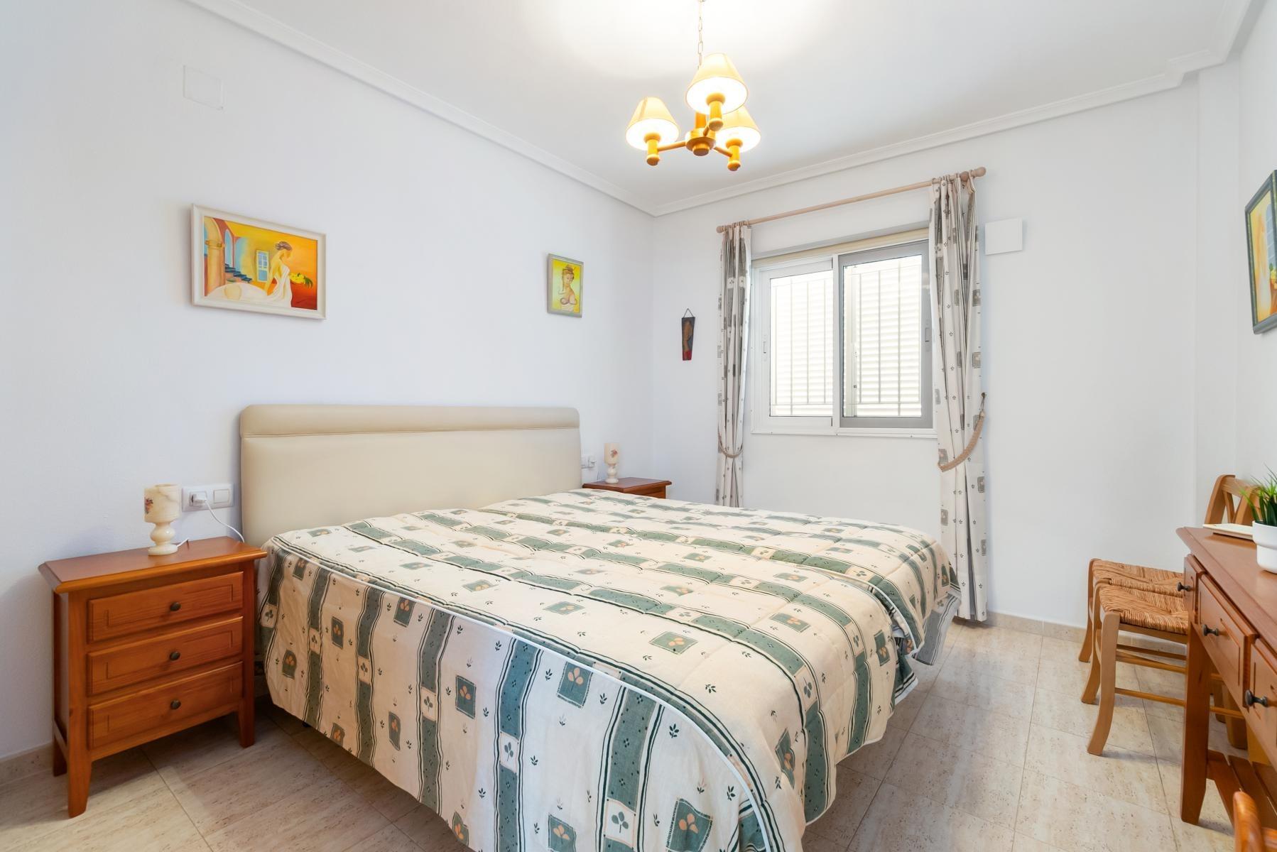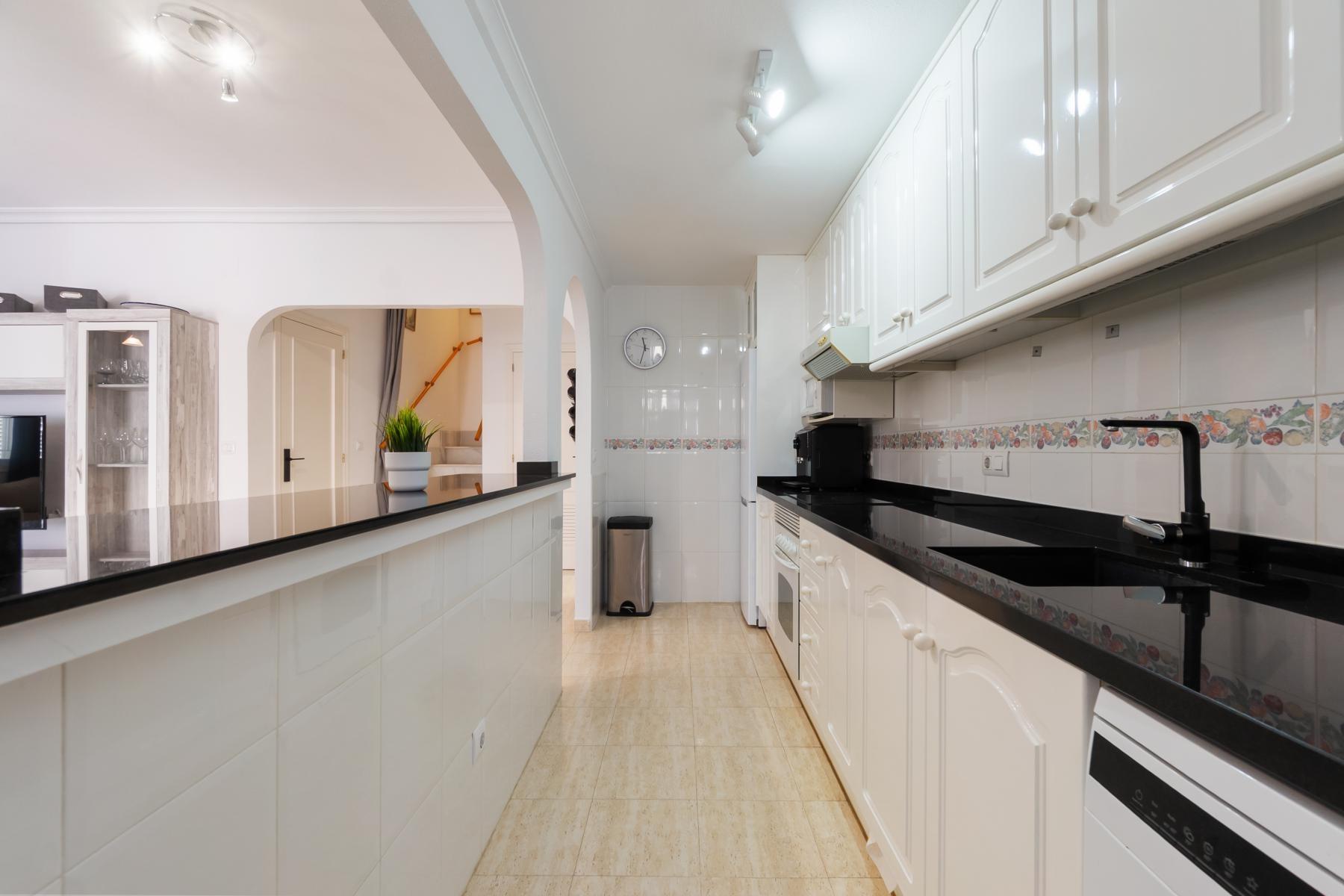 Adosado tipo Quad en esquina, de dos plantas más solárium, con escalera interior y ubicado a pocos pasos de la piscina comunitaria, en la consolidada y demandada urbanización Zeniamar V, Orihuela Costa. Una propiedad que destaca por su luminosidad, comodidad y entorno tranquilo, ideal tanto como residencia habitual como vivienda vacacional.~~La urbanización ofrece amplias zonas ajardinadas, gran piscina comunitaria y un ambiente cuidado, con una excelente ubicación próxima a supermercados, cafeterías, restaurantes, el reconocido Centro Comercial Zenia Boulevard, el mercadillo de Playa Flamenca y las playas de Orihuela Costa.~~En la planta baja, la vivienda dispone de una amplia terraza acristalada que conecta directamente con el salón, cocina americana totalmente equipada con electrodomésticos y galería, un dormitorio, un baño completo reformado con suelo radiante, y un práctico trastero.~~La primera planta cuenta con dos dormitorios adicionales, un segundo baño y una terraza con zona acristalada y zona descubierta, con vistas despejadas, ideal para el descanso o el ocio.~~En la planta solárium encontramos una salita polivalente, adaptable a distintos usos (almacenamiento, despacho, zona relax) y una amplia terraza descubierta, perfecta para disfrutar del excelente clima de la zona durante todo el año.~~La propiedad se completa con un jardín embaldosado en esquina de aproximadamente 69 m², con espacio suficiente para comedor exterior, barbacoa o zona chill-out, ideal para reuniones familiares o con amigos.~~La vivienda se encuentra en perfecto estado de conservación, dispone de aire acondicionado por splits inverter en todas las estancias, se vende totalmente amueblada y equipada, e incluye plaza de garaje y trastero en el garaje subterráneo del residencial.~