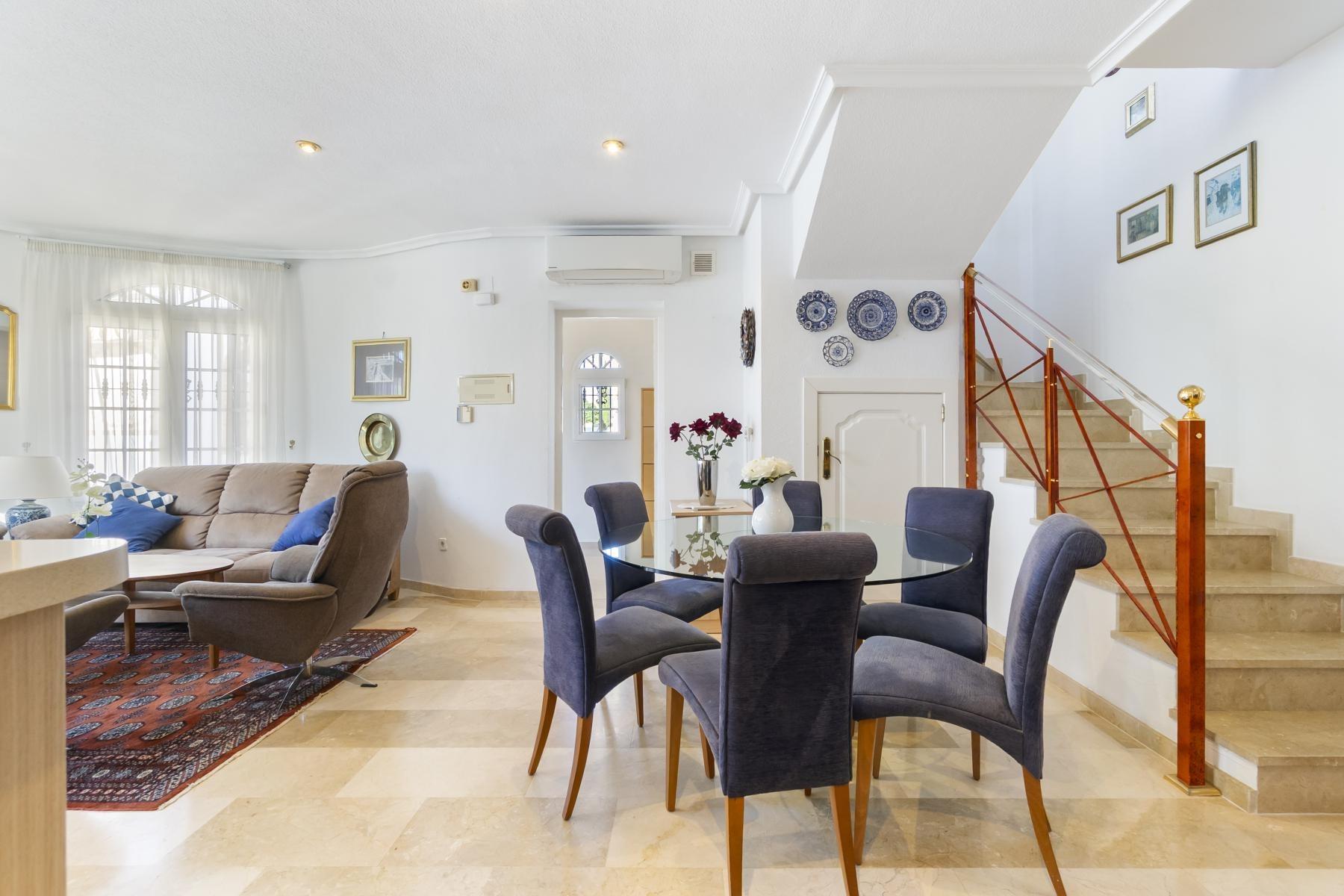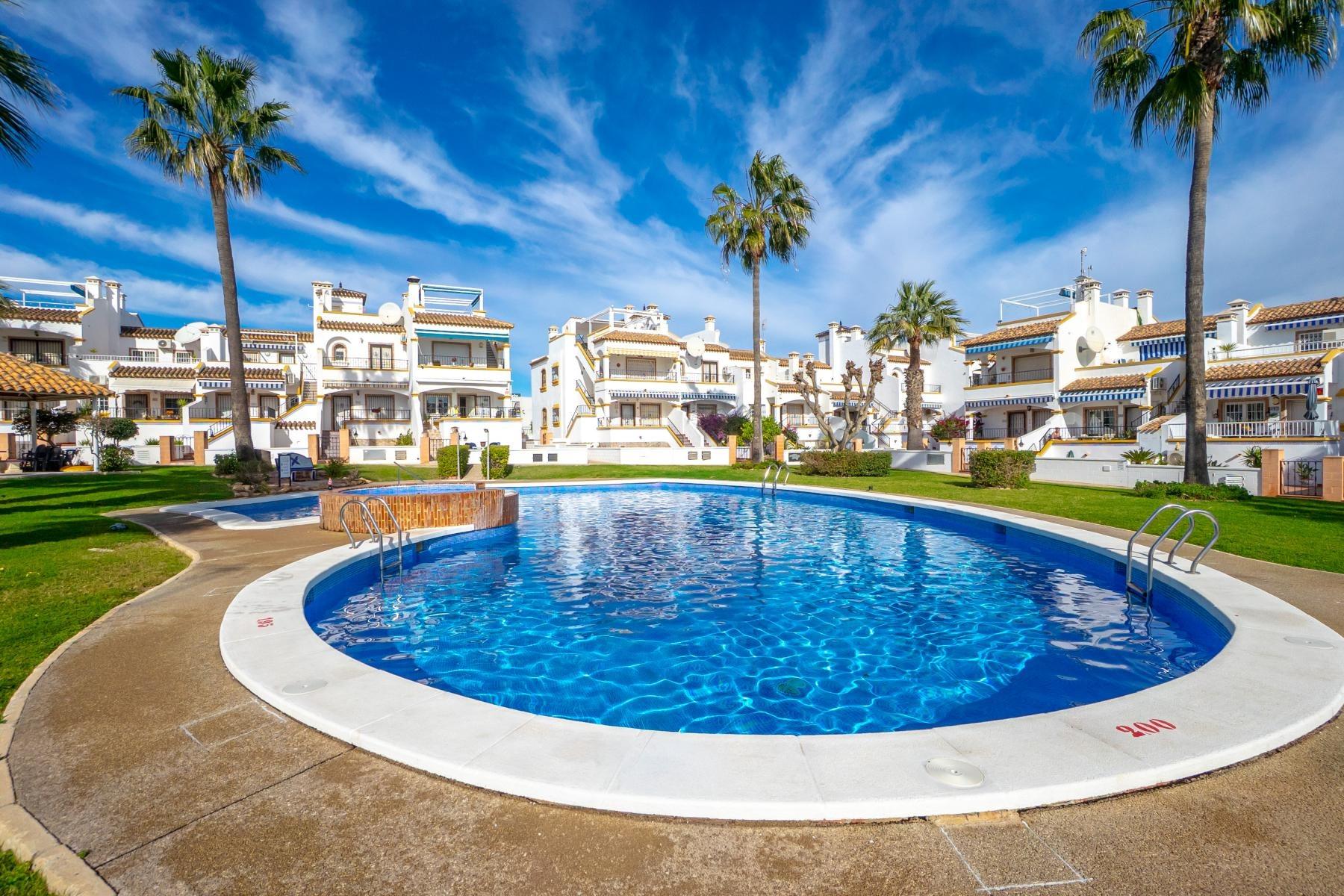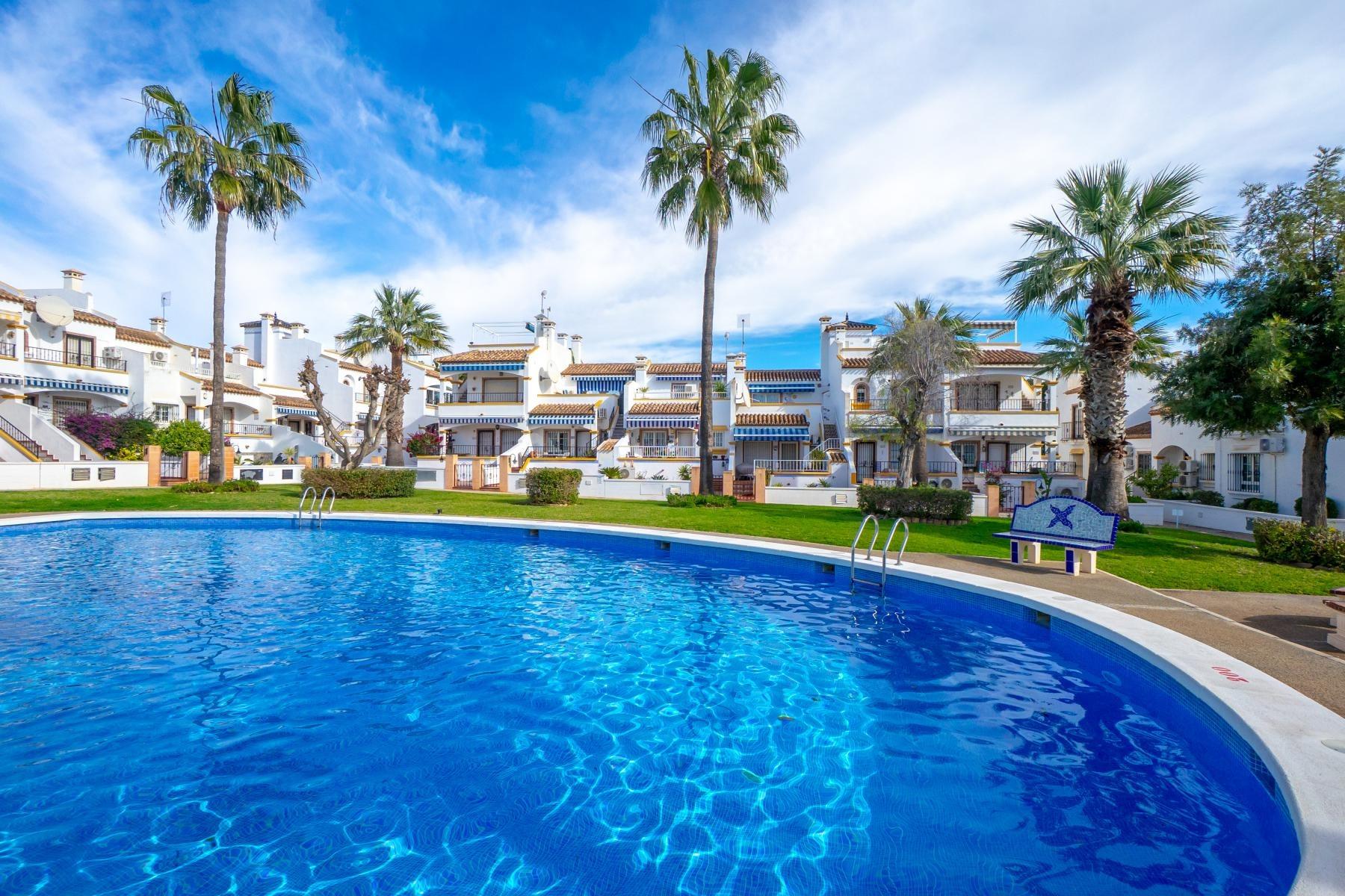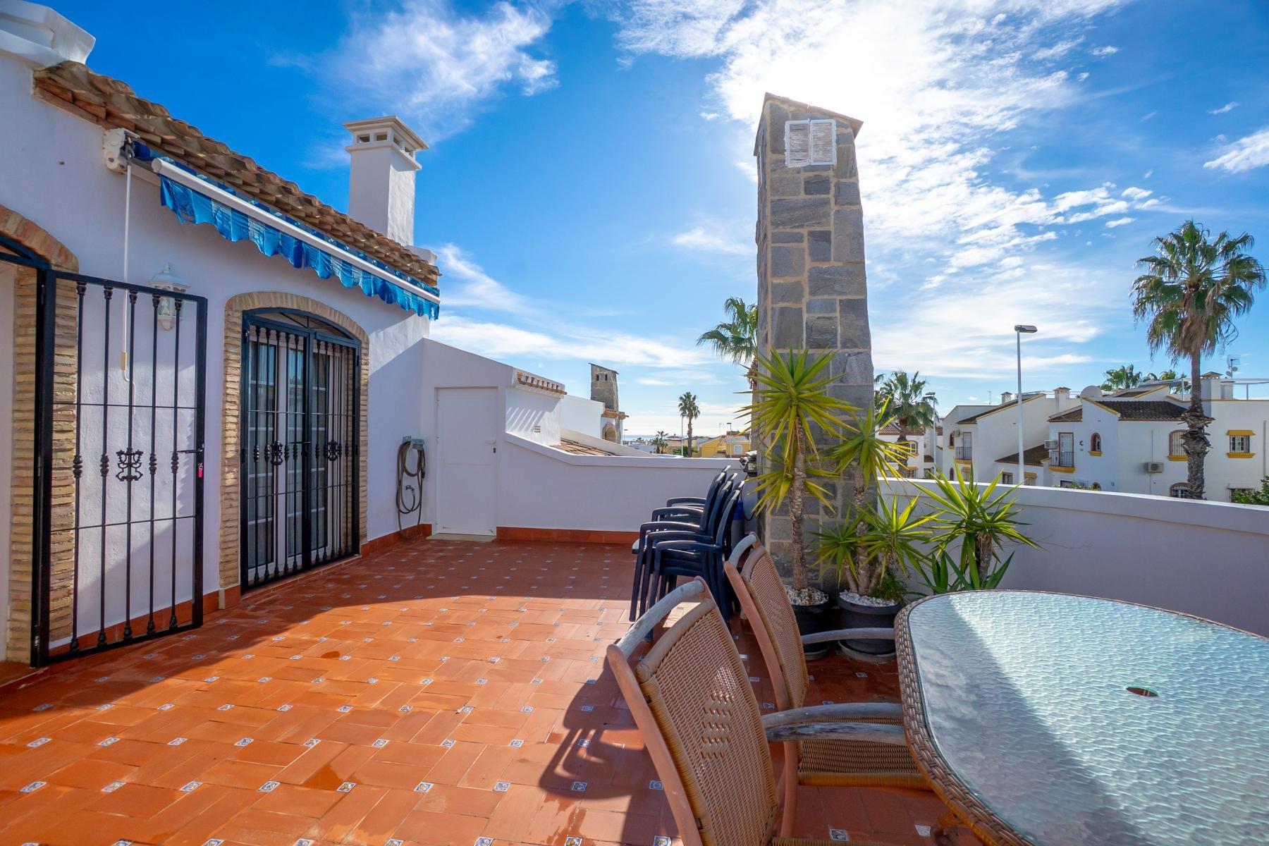 Ubicado en la consolidada zona residencial de Los Dolses, en Orihuela Costa, este chalet se encuentra en un entorno muy demandado tanto por clientela nacional como internacional, gracias a su amplia oferta de servicios y excelente conexión. A poca distancia se sitúan centros comerciales como Los Dolses y Zenia Boulevard, supermercados, restaurantes, entidades bancarias y prestigiosos campos de golf como Villamartín. Además, ofrece acceso rápido a las reconocidas playas de Orihuela Costa, entre ellas La Zenia, Cala Mosca y Cala Estaca.~~La vivienda forma parte de un complejo residencial privado que ofrece a sus residentes una piscina comunitaria de uso exclusivo, rodeada de zonas ajardinadas cuidadosamente mantenidas, ideales para el descanso y el disfrute en un entorno tranquilo.~~La propiedad se distribuye en dos plantas y destaca por su funcionalidad, luminosidad y confort.~En el exterior, un jardín embaldosado da la bienvenida a la vivienda, junto a una amplia terraza con toldos, perfecta para reuniones con familiares y amigos y para disfrutar del aire libre durante todo el año. Dispone además de un garaje cerrado, que aporta comodidad y seguridad para el estacionamiento.~~En la planta baja encontramos un espacioso salón-comedor con cocina americana totalmente equipada, creando un ambiente abierto y acogedor. En esta planta se sitúa también una zona de lavandería, dos dormitorios, uno de ellos con baño en suite, y un segundo baño completo, ambos reformados.~~La planta primera alberga dos dormitorios adicionales, uno de ellos con baño en suite y acceso directo a una magnífica terraza/solárium de aproximadamente 32 m², que cuenta con un práctico trastero y está acondicionada para disfrutar de barbacoas y momentos al aire libre.~~Con orientación sureste, la vivienda disfruta de abundante luz natural y se encuentra en muy buen estado de conservación. Es una opción ideal tanto como residencia habitual, por su cercanía a colegios y servicios, como vivienda vacacional. Se vende totalmente amueblada y equipada, lista para entrar a vivir.~~Contáctenos para más información o para concertar una visita y descubrir personalmente todo lo que esta propiedad puede ofrecerle.~