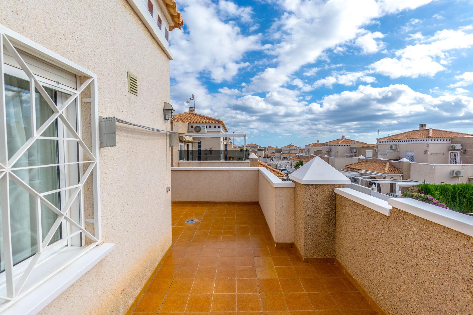 Atractiva casa adosada en la popular zona de Altos de la Bahía, Aguas Nuevas, a tan solo 1,7 km de la playa de La Mata. La propiedad cuenta con cuatro dormitorios y dos baños, una terraza de 47 m² y un solárium de 19 m² orientado al sur. La urbanización dispone de una preciosa piscina, ideal para relajarse en los días soleados.~~Se vende amueblada.~~A poca distancia de la playa, tiendas y restaurantes. Perfecta como casa de vacaciones o residencia permanente.~